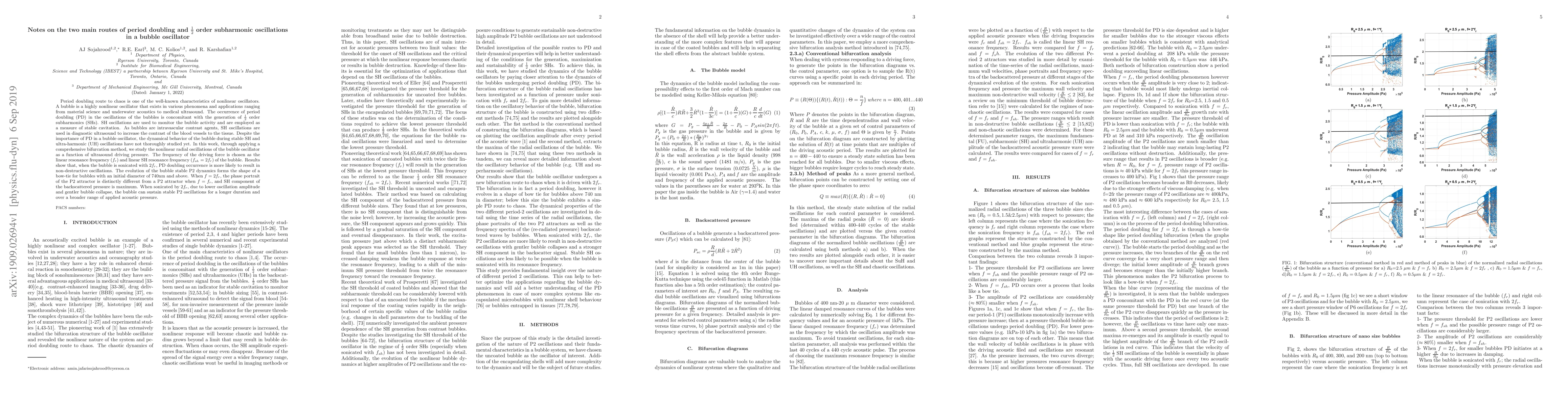 Period doubling route to chaos is one of the well-known characteristics of nonlinear oscillators. A bubble is a highly nonlinear oscillator that exists in various phenomena and applications ranging from material science and underwater acoustics to medical ultrasound. The occurrence of period doubling (PD) in the oscillations of the bubbles is concomitant with the generation of 1/2 order subharmonics (SHs). SH oscillations are used to monitor the bubble activity and are employed as a measure of stable cavitation. As bubbles are intravascular contrast agents, SH oscillations are used in diagnostic ultrasound to increase the contrast of the blood vessels to the tissue. Despite the importance of PD in a bubble oscillator, the dynamical behavior of the bubble during stable SH and ultra-harmonic (UH) oscillations have not thoroughly studied yet. In this work, through applying a comprehensive bifurcation method, we study the nonlinear radial oscillations of the bubble oscillator as a function of ultrasound driving pressure. The frequency of the driving force is chosen as the linear resonance frequency (fr) and linear SH resonance frequency (fsh=2fr) of the bubble. Results show that, when the bubble is sonicated with 2fr, PD doubling occurrence is more likely to result in non-destructive oscillations. The evolution of the bubble stable P2 dynamics forms the shape of a bow-tie for bubbles with an initial diameter of 740nm and above. When f=2fr, the phase portrait of the P2 attractor is distinctly different from a P2 attractor when f=fr, and SH component of the backscattered pressure is maximum. When sonicated by 2fr, due to lower oscillation amplitude and gentler bubble collapse, the bubble can sustain stable P2 oscillations for a longer duration and over a broader range of applied acoustic pressure.