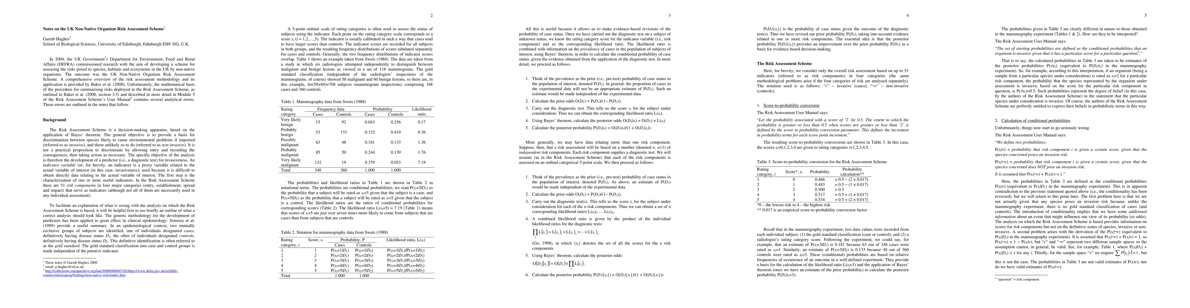In 2004, the UK Government's Department for Environment, Food and Rural Affairs commissioned research with the aim of developing a scheme for assessing the risks posed to species, habitats and ecosystems in the UK by non-native organisms. The outcome was the UK Non-Native Organism Risk Assessment Scheme. Unfortunately, the mathematical basis of the procedure for summarising risks deployed in the Risk Assessment Scheme, as outlined in Baker et al. (2008) and described in more detail in the Risk Assessment Scheme's User Manual, contains several analytical errors. These errors are outlined in the notes that follow.