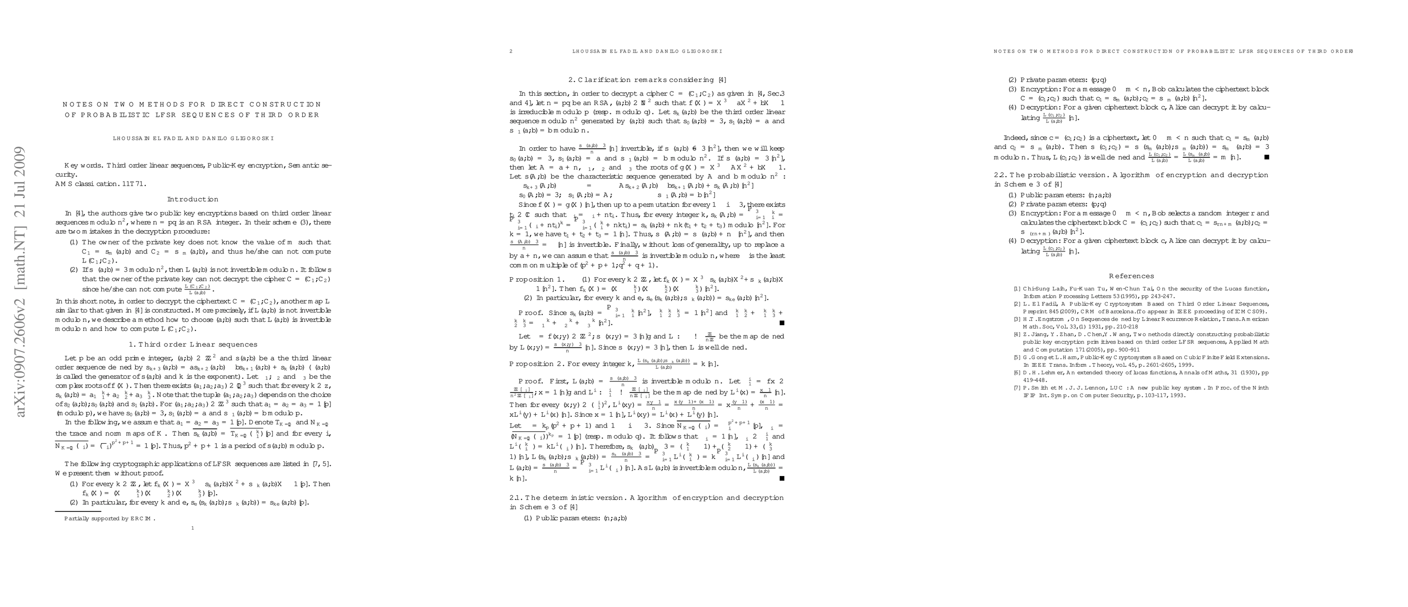 In \cite{Tm}, the authors give two public key encryptions based on third order linear sequences modulo $n^2$, where $n=pq$ is an RSA integer. In their scheme (3), there are two mistakes in the decryption procedure