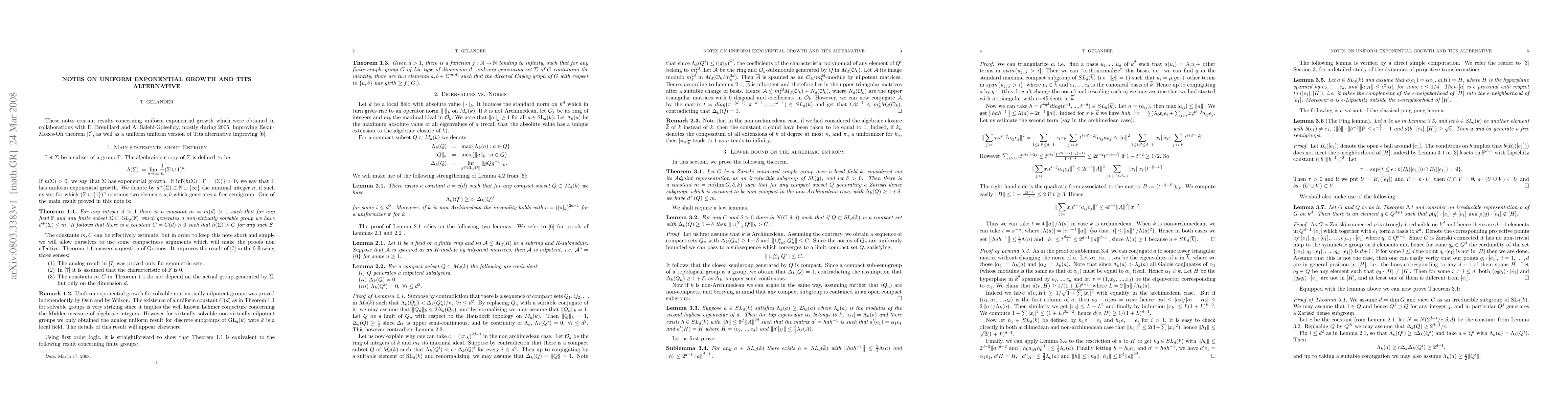 These notes contain results concerning uniform exponential growth which were obtained in collaborations with E. Breuillard and A. Salehi-Golsefidy, mostly during 2005, improving Eskin-Mozes-Oh theorem \cite{EMO}, as well as a uniform uniform version of Tits alternative improving \cite{uti}.