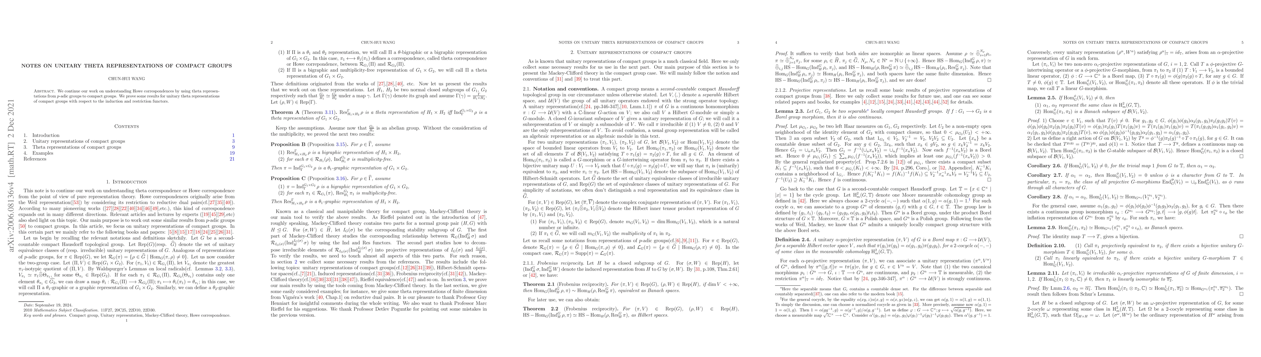 Summary: This paper investigates Howe correspondences via theta representations, proving new results for unitary theta representations of compact groups concerning induction and restriction functors, advancing the understanding of p-adic group representations.