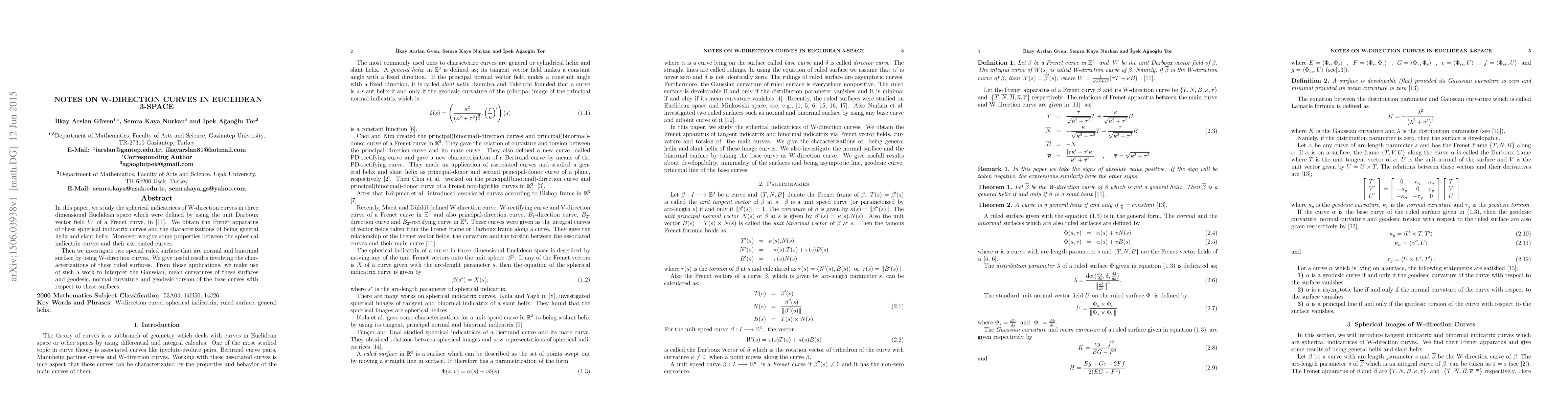 In this paper, we study the spherical indicatrices of W-direction curves in three dimensional Euclidean space which were defined by using the unit Darboux vector field W of a Frenet curve, in [11]. We obtain the Frenet apparatus of these spherical indicatrix curves and the characterizations of being general helix and slant helix. Moreover we give some properties between the spherical indicatrix curves and their associated curves. Then we investigate two special ruled surface that are normal and binormal surface by using W-direction curves. We give useful results involving the char- acterizations of these ruled surfaces. From those applications, we make use of such a work to interpret the Gaussian, mean curvatures of these surfaces and geodesic, normal curvature and geodesic torsion of the base curves with respect to these surfaces.