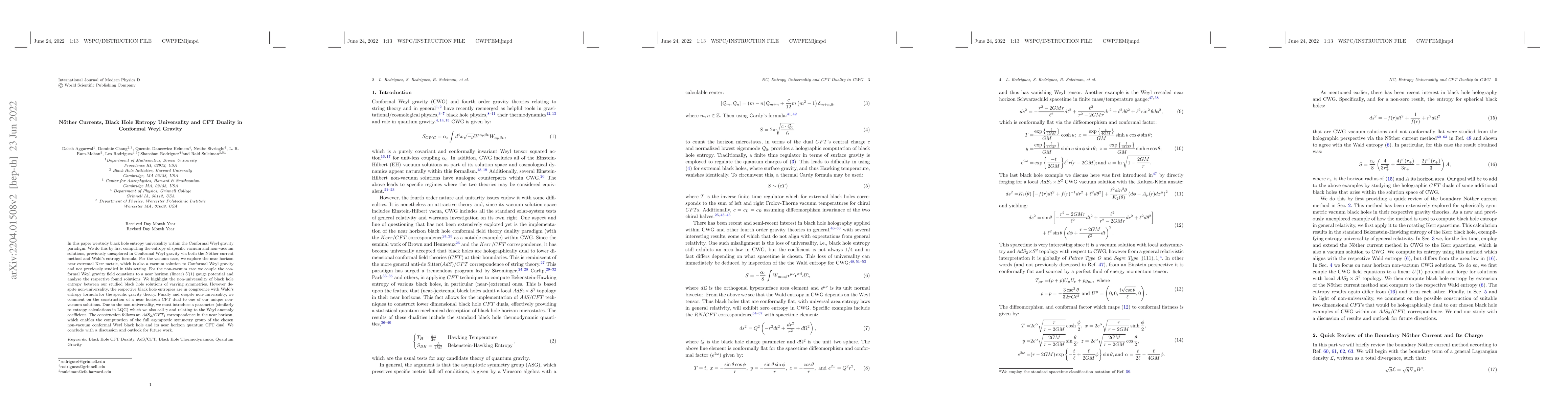The paper presents a detailed analysis of black hole entropy using both Nöther current and Wald's entropy formulas in Conformal Weyl Gravity, highlighting non-universality and constructing a near-horizon AdS2/CFT1 correspondence.