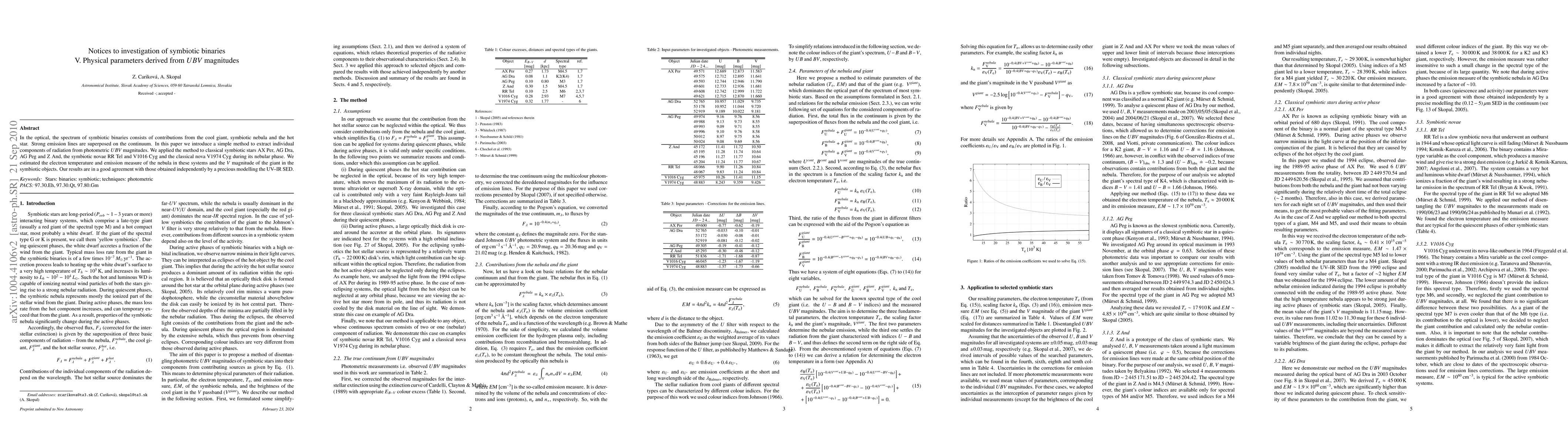 In the optical, the spectrum of symbiotic binaries consists of contributions from the cool giant, symbiotic nebula and the hot star. Strong emission lines are superposed on the continuum. In this paper we introduce a simple method to extract individual components of radiation from photometric UBV magnitudes. We applied the method to classical symbiotic stars AX Per, AG Dra, AG Peg and Z And, the symbiotic novae RR Tel and V1016 Cyg and the classical nova V1974 Cyg during its nebular phase. We estimated the electron temperature and emission measure of the nebula in these systems and the V magnitude of the giant in the symbiotic objects. Our results are in a good agreement with those obtained independently by a precious modelling the UV-IR SED.