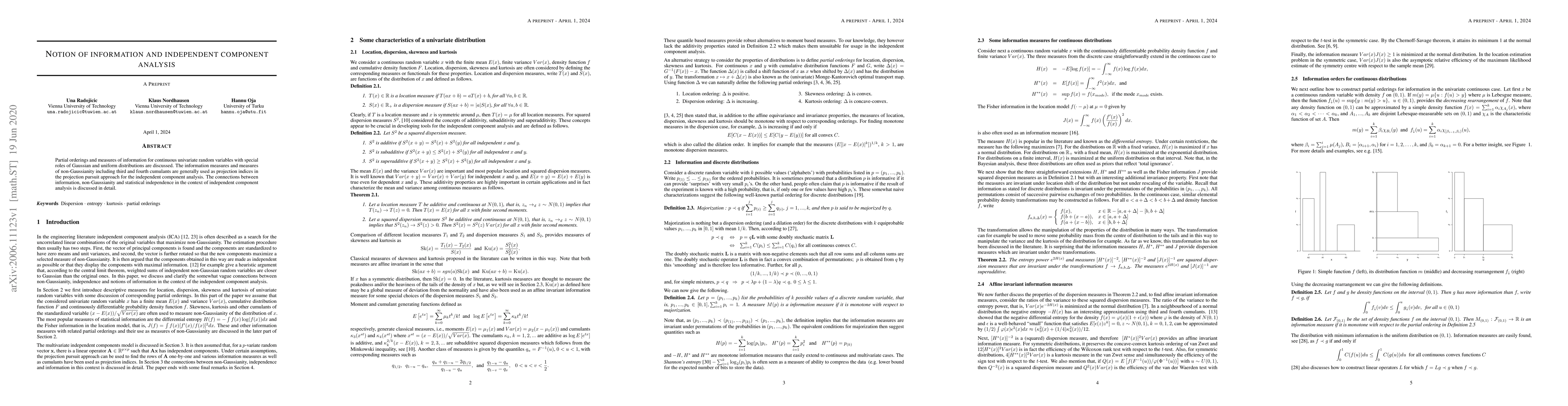 Partial orderings and measures of information for continuous univariate random variables with special roles of Gaussian and uniform distributions are discussed. The information measures and measures of non-Gaussianity including third and fourth cumulants are generally used as projection indices in the projection pursuit approach for the independent component analysis. The connections between information, non-Gaussianity and statistical independence in the context of independent component analysis is discussed in detail.