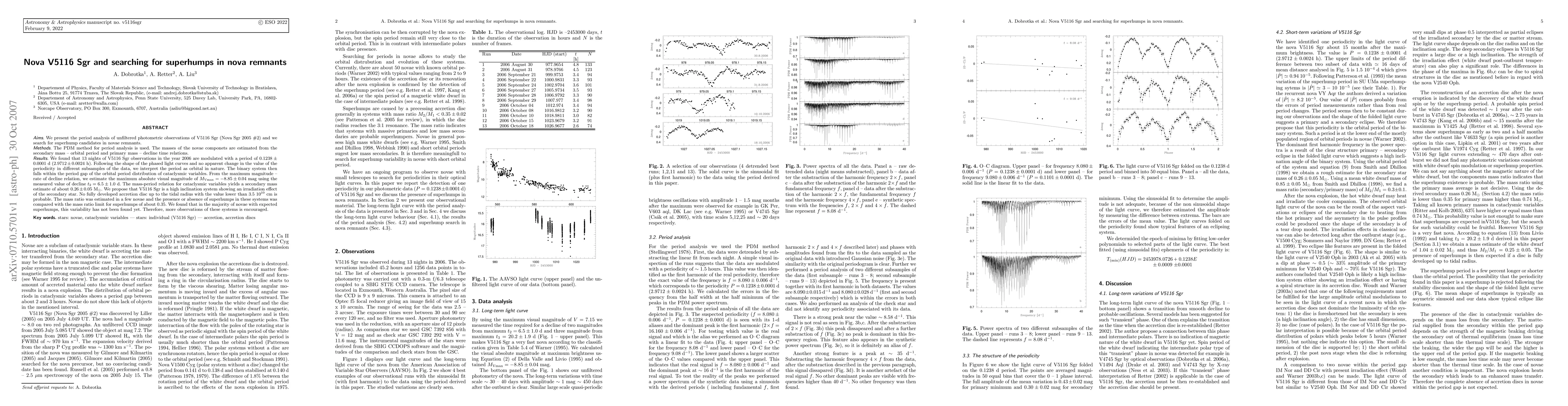 The study analyzes light curves of Nova V5116 Sgr (2005 #2) and finds an orbital period of approximately 2.97 hours, placing it in the cataclysmic variable period gap. Estimating component masses, the secondary is about 0.26 solar masses. No superhumps were detected, suggesting an irradiation effect on the secondary and lack of a fully developed accretion disk. The research indicates that many novae with expected superhumps still need further observation to confirm their absence.