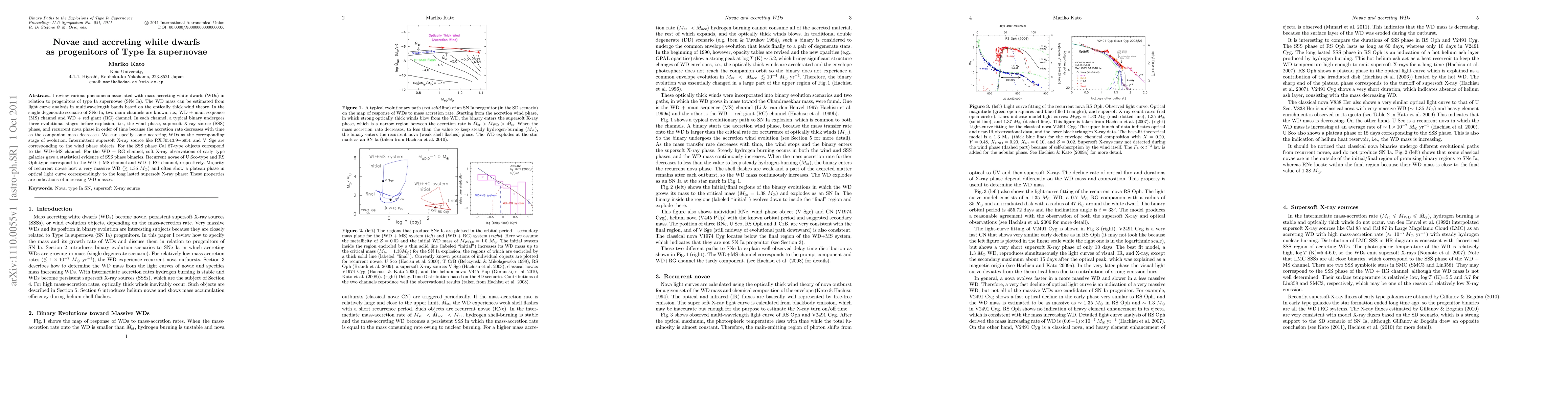 I review various phenomena associated with mass-accreting white dwarfs (WDs) in relation to progenitors of type Ia supernovae (SNe Ia). The WD mass can be estimated from light curve analysis in multiwavelength bands based on the optically thick wind theory. In the single degenerate scenario of SNe Ia, two main channels are known, i.e., WD + main sequence (MS) channel and WD + red giant (RG) channel. In each channel, a typical binary undergoes three evolutional stages before explosion, i.e., the wind phase, supersoft X-ray source (SSS) phase, and recurrent nova phase in order of time because the accretion rate decreases with time as the companion mass decreases. We can specify some accreting WDs as the corresponding stage of evolution. Intermittent supersoft X-ray source like RX J0513.9-6951 and V Sge are corresponding to the wind phase objects. For the SSS phase Cal 87-type objects correspond to the WD+MS channel. For the WD + RG channel, soft X-ray observations of early type galaxies gave a statistical evidence of SSS phase binaries. Recurrent novae of U Sco-type and RS Oph-type correspond to the WD + MS channel and WD + RG channel, respectively. Majority of recurrent novae host a very massive WD (~> 1.35 Mo) and often show a plateau phase in optical light curve correspondingly to the long lasted supersoft X-ray phase: These properties are indications of increasing WD masses.