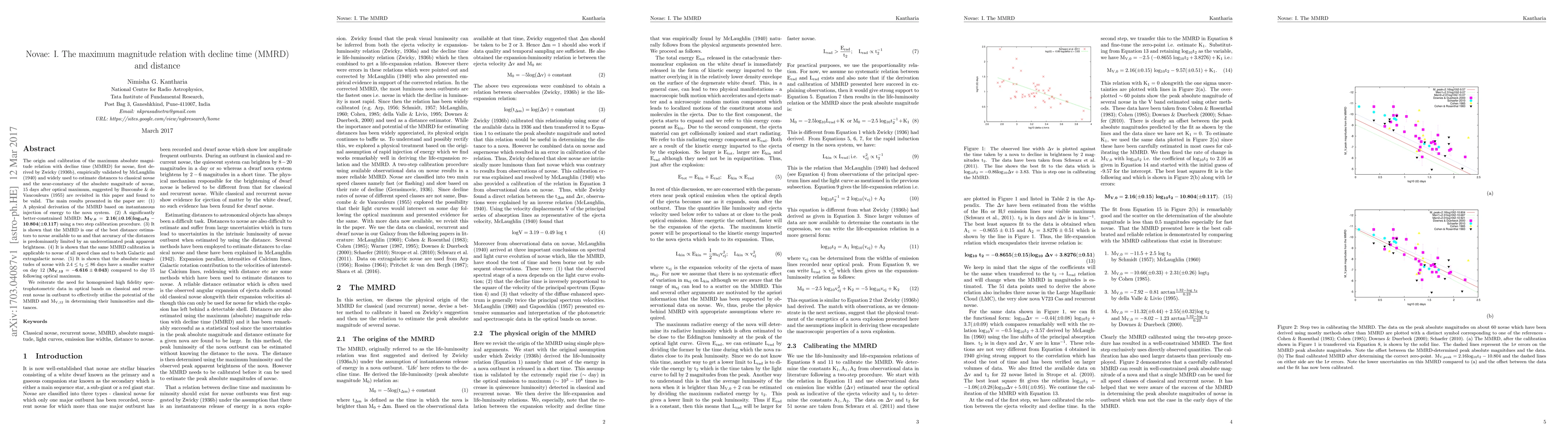 The origin and calibration of the maximum absolute magnitude relation with decline time (MMRD) for novae, first derived by Zwicky (1936) empirically validated by McLaughlin (1940) and widely used to estimate distances to classical novae and the near-constancy of the absolute magnitude of novae, 15 days after optical maximum, suggested by Buscombe and de Vaucouleurs (1955) are revisited in this paper and found to be valid. The main results presented in the paper are: (1) A physical derivation of the MMRD based on instantaneous injection of energy to the nova system. (2) A significantly better-constrained MMRD: M_{V,0} = 2.16(+-0.16)log_{10}t_2 - 10.804(+-0.117) using a two step calibration procedure. (3) It is shown that the MMRD is one of the best distance estimators to novae available to us and that accuracy of the distances is predominantly limited by an underestimated peak apparent brightness. (4) It is shown that the same MMRD calibration is applicable to novae of all speed class and to both Galactic and extragalactic novae. (5) It is shown that the absolute magnitudes of novae with 2.4 < t_2 < 86$days have a smaller scatter on day 12 (M_{V,12} = -6.616 +-0.043) compared to day 15 following optical maximum. We reiterate the need for homogenised high fidelity spectrophotometric data in optical bands on classical and recurrent novae in outburst to effectively utilise the potential of the MMRD and M_{V,12} in determining their luminosities and distances.