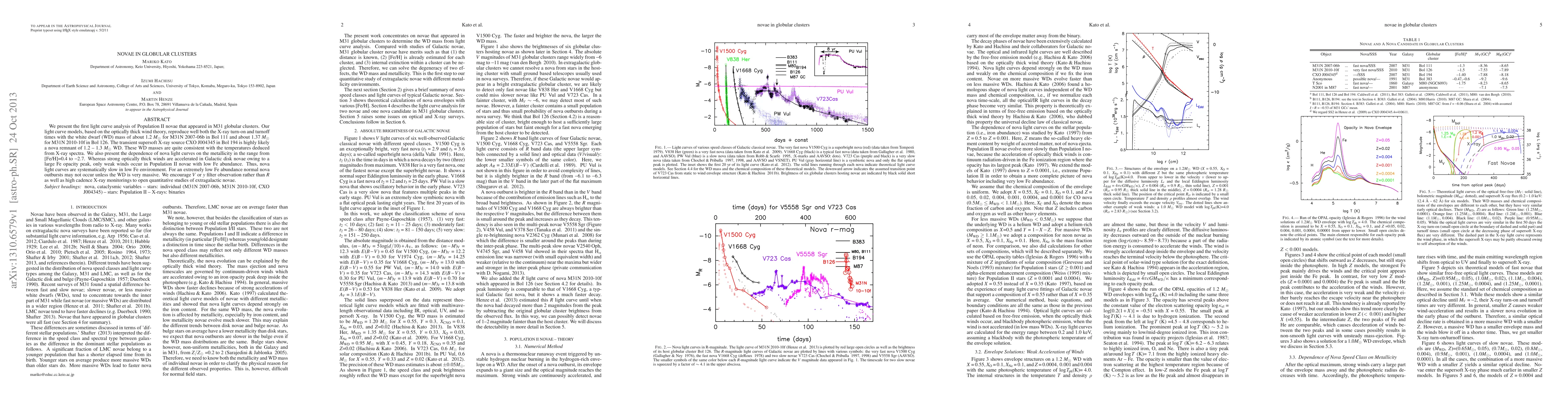 This paper analyzes the light curves of Population II novae in M31 globular clusters, revealing white dwarf masses of approximately 1.2 and 1.3 Mo. It highlights the influence of metallicity on nova light curves, suggesting that low Fe environments lead to slower novae due to weak winds.