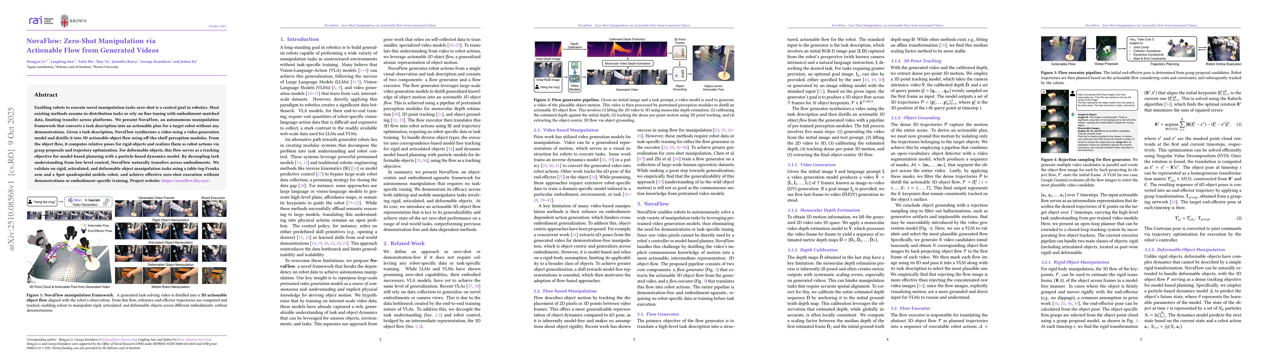 Enabling robots to execute novel manipulation tasks zero-shot is a central goal in robotics. Most existing methods assume in-distribution tasks or rely on fine-tuning with embodiment-matched data, limiting transfer across platforms. We present NovaFlow, an autonomous manipulation framework that converts a task description into an actionable plan for a target robot without any demonstrations. Given a task description, NovaFlow synthesizes a video using a video generation model and distills it into 3D actionable object flow using off-the-shelf perception modules. From the object flow, it computes relative poses for rigid objects and realizes them as robot actions via grasp proposals and trajectory optimization. For deformable objects, this flow serves as a tracking objective for model-based planning with a particle-based dynamics model. By decoupling task understanding from low-level control, NovaFlow naturally transfers across embodiments. We validate on rigid, articulated, and deformable object manipulation tasks using a table-top Franka arm and a Spot quadrupedal mobile robot, and achieve effective zero-shot execution without demonstrations or embodiment-specific training. Project website: https://novaflow.lhy.xyz/.