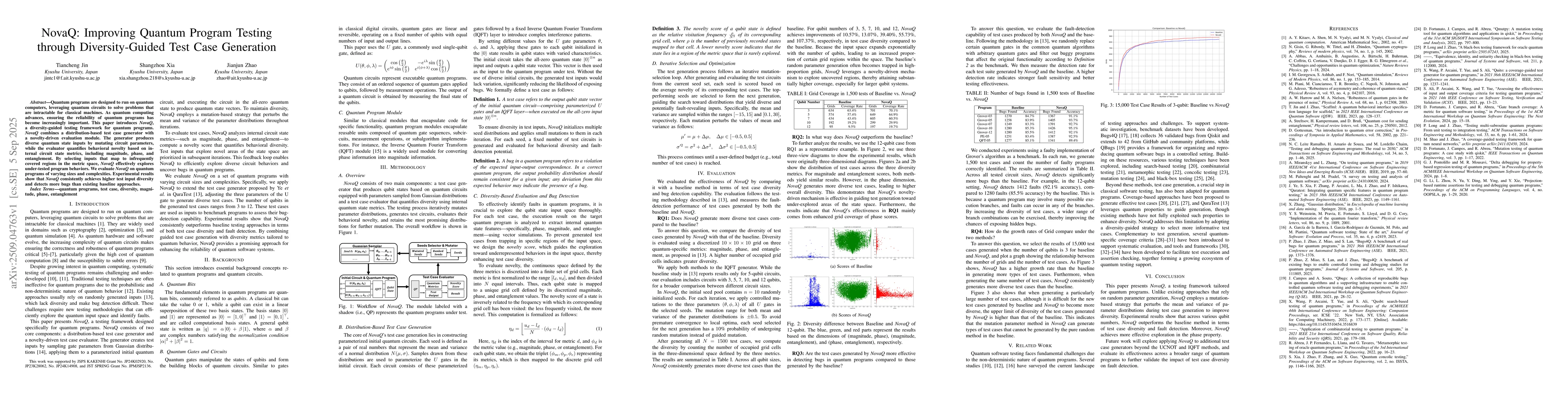 Quantum programs are designed to run on quantum computers, leveraging quantum circuits to solve problems that are intractable for classical machines. As quantum computing advances, ensuring the reliability of quantum programs has become increasingly important. This paper introduces NovaQ, a diversity-guided testing framework for quantum programs. NovaQ combines a distribution-based test case generator with a novelty-driven evaluation module. The generator produces diverse quantum state inputs by mutating circuit parameters, while the evaluator quantifies behavioral novelty based on internal circuit state metrics, including magnitude, phase, and entanglement. By selecting inputs that map to infrequently covered regions in the metric space, NovaQ effectively explores under-tested program behaviors. We evaluate NovaQ on quantum programs of varying sizes and complexities. Experimental results show that NovaQ consistently achieves higher test input diversity and detects more bugs than existing baseline approaches.