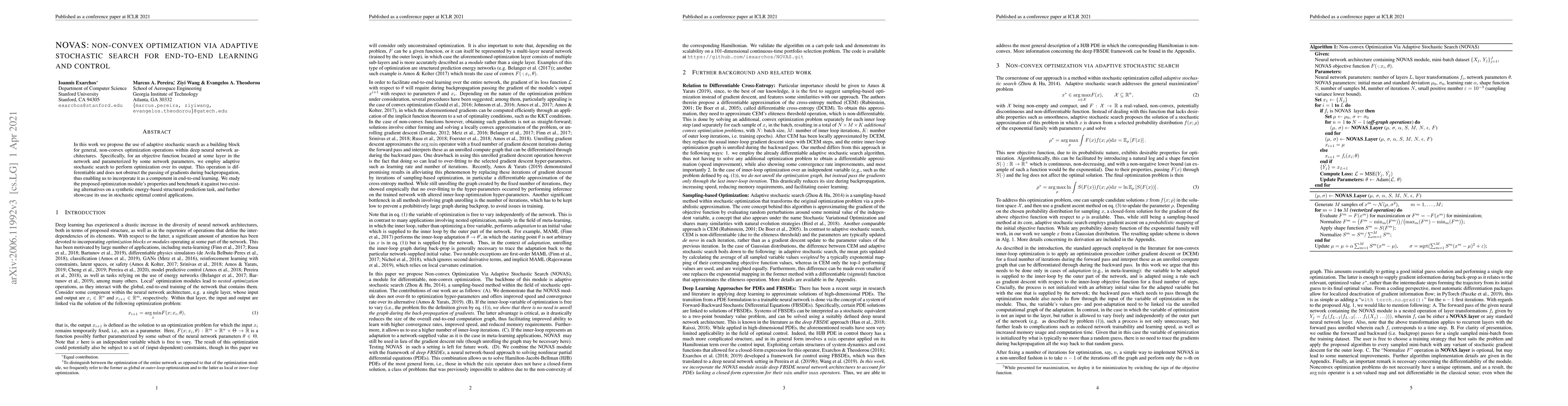 NOVAS introduces adaptive stochastic search for non-convex optimization in deep neural networks, enabling differentiable optimization without gradient obstruction. Benchmarked on a structured prediction task and applied in stochastic optimal control, it outperforms existing methods.