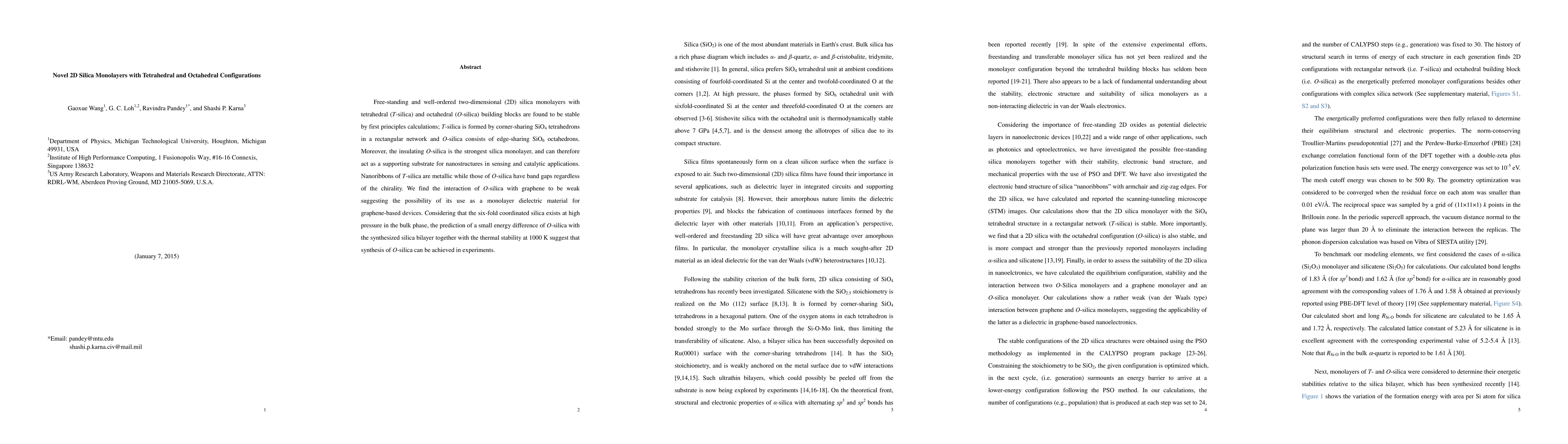 Free-standing and well-ordered two-dimensional (2D) silica monolayers with tetrahedral (T-silica) and octahedral (O-silica) building blocks are found to be stable by first principles calculations; T-silica is formed by corner-sharing SiO4 tetrahedrons in a rectangular network and O-silica consists of edge-sharing SiO6 octahedrons. Moreover, the insulating O-silica is the strongest silica monolayer, and can therefore act as a supporting substrate for nanostructures in sensing and catalytic applications. Nanoribbons of T-silica are metallic while those of O-silica have band gaps regardless of the chirality. We find the interaction of O-silica with graphene to be weak suggesting the possibility of its use as a monolayer dielectric material for graphene-based devices. Considering that the six-fold coordinated silica exists at high pressure in the bulk phase, the prediction of a small energy difference of O-silica with the synthesized silica bilayer together with the thermal stability at 1000 K suggest that synthesis of O-silica can be achieved in experiments.