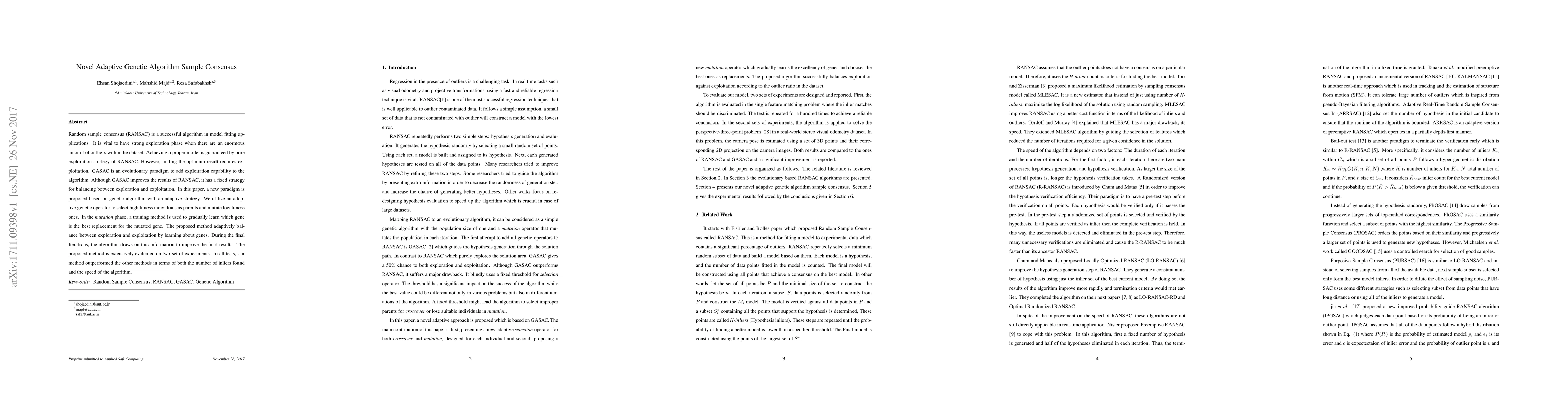 A new adaptive genetic algorithm called GASAC is proposed to improve Random Sample Consensus (RANSAC) for robust model fitting, outperforming traditional methods in terms of accuracy and speed.