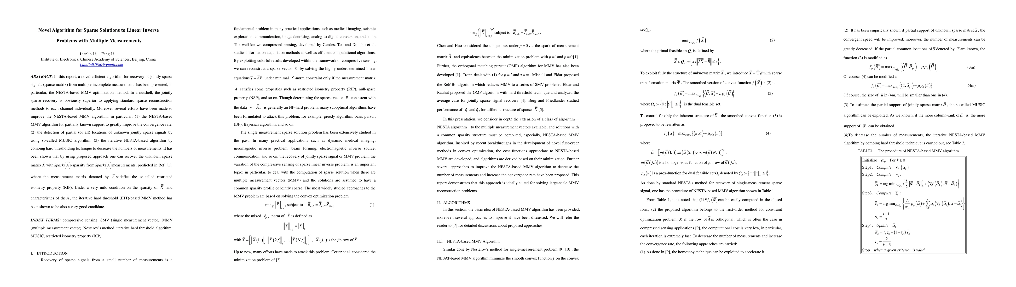 In this report, a novel efficient algorithm for recovery of jointly sparse signals (sparse matrix) from multiple incomplete measurements has been presented, in particular, the NESTA-based MMV optimization method. In a nutshell, the jointly sparse recovery is obviously superior to applying standard sparse reconstruction methods to each channel individually. Moreover several efforts have been made to improve the NESTA-based MMV algorithm, in particular, (1) the NESTA-based MMV algorithm for partially known support to greatly improve the convergence rate, (2) the detection of partial (or all) locations of unknown jointly sparse signals by using so-called MUSIC algorithm; (3) the iterative NESTA-based algorithm by combing hard thresholding technique to decrease the numbers of measurements. It has been shown that by using proposed approach one can recover the unknown sparse matrix X with () Spark A -sparsity from () Spark A measurements, predicted in Ref. [1], where the measurement matrix denoted by A satisfies the so-called restricted isometry property (RIP). Under a very mild condition on the sparsity of X and characteristics of the A, the iterative hard threshold (IHT)-based MMV method has been shown to be also a very good candidate.