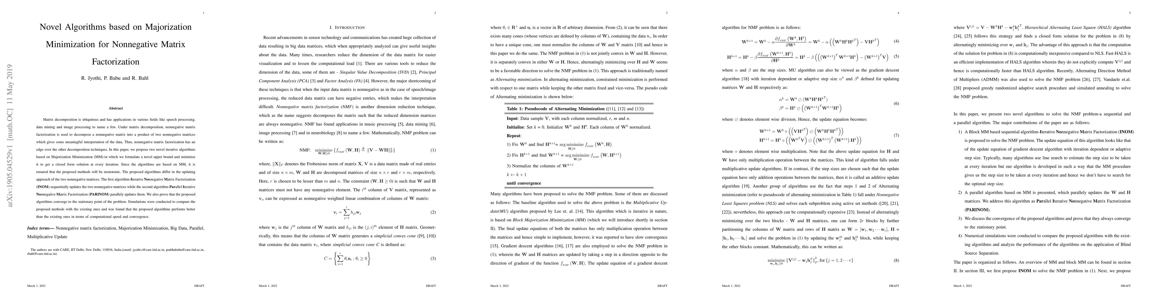 Matrix decomposition is ubiquitous and has applications in various fields like speech processing, data mining and image processing to name a few. Under matrix decomposition, nonnegative matrix factorization is used to decompose a nonnegative matrix into a product of two nonnegative matrices which gives some meaningful interpretation of the data. Thus, nonnegative matrix factorization has an edge over the other decomposition techniques. In this paper, we propose two novel iterative algorithms based on Majorization Minimization (MM)-in which we formulate a novel upper bound and minimize it to get a closed form solution at every iteration. Since the algorithms are based on MM, it is ensured that the proposed methods will be monotonic. The proposed algorithms differ in the updating approach of the two nonnegative matrices. The first algorithm-Iterative Nonnegative Matrix Factorization (INOM) sequentially updates the two nonnegative matrices while the second algorithm-Parallel Iterative Nonnegative Matrix Factorization (PARINOM) parallely updates them. We also prove that the proposed algorithms converge to the stationary point of the problem. Simulations were conducted to compare the proposed methods with the existing ones and was found that the proposed algorithms performs better than the existing ones in terms of computational speed and convergence. KeyWords: Nonnegative matrix factorization, Majorization Minimization, Big Data, Parallel, Multiplicative Update