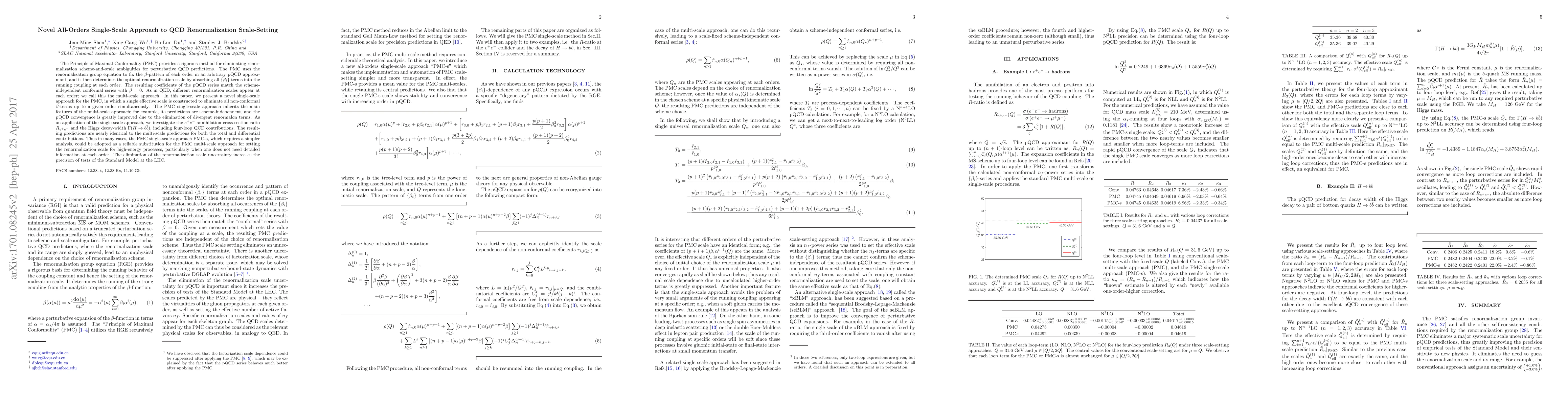 This paper introduces a novel single-scale approach based on the Principle of Maximal Conformality (PMC) to eliminate renormalization ambiguities in QCD, improving pQCD convergence and precision. The PMC single-scale approach simplifies analysis while maintaining accuracy comparable to the multi-scale approach for high-energy processes.