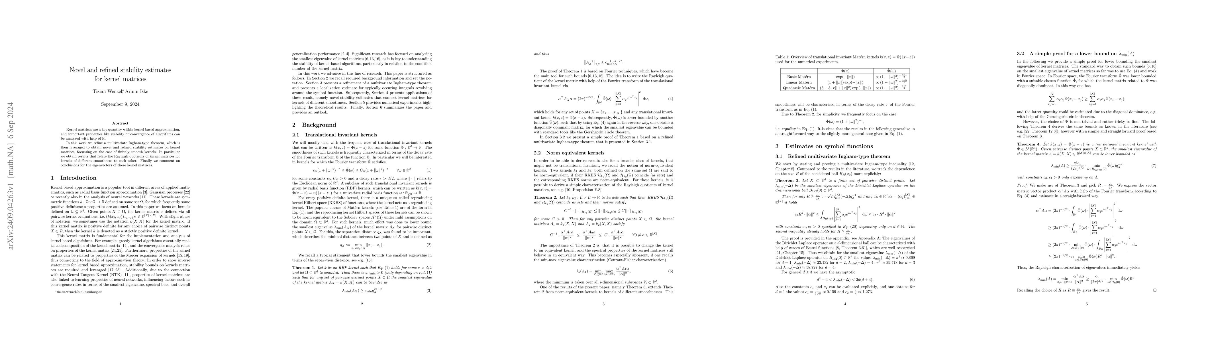 This paper refines a multivariate Ingham-type theorem to derive novel stability estimates for kernel matrices, particularly focusing on finitely smooth kernels. The refined estimates relate the Rayleigh quotients of kernel matrices across different smoothness levels and discuss implications for the eigenvectors.