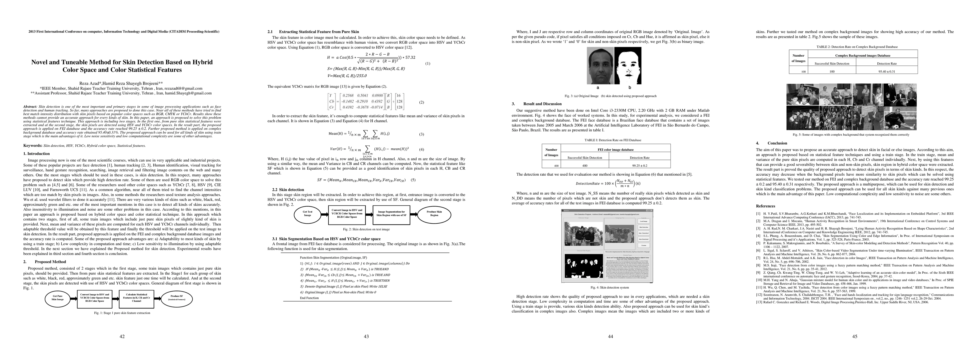 Skin detection is one of the most important and primary stages in some of image processing applications such as face detection and human tracking. So far, many approaches are proposed to done this case. Near all of these methods have tried to find best match intensity distribution with skin pixels based on popular color spaces such as RGB, CMYK or YCbCr. Results show these methods cannot provide an accurate approach for every kinds of skin. In this paper, an approach is proposed to solve this problem using statistical features technique. This approach is including two stages. In the first one, from pure skin statistical features were extracted and at the second stage, the skin pixels are detected using HSV and YCbCr color spaces. In the result part, the proposed approach is applied on FEI database and the accuracy rate reached 99.25 + 0.2. Further proposed method is applied on complex background database and accuracy rate obtained 95.40+0.31%. The proposed approach can be used for all kinds of skin using train stage which is the main advantages of it. Low noise sensitivity and low computational complexity are some of other advantages.
