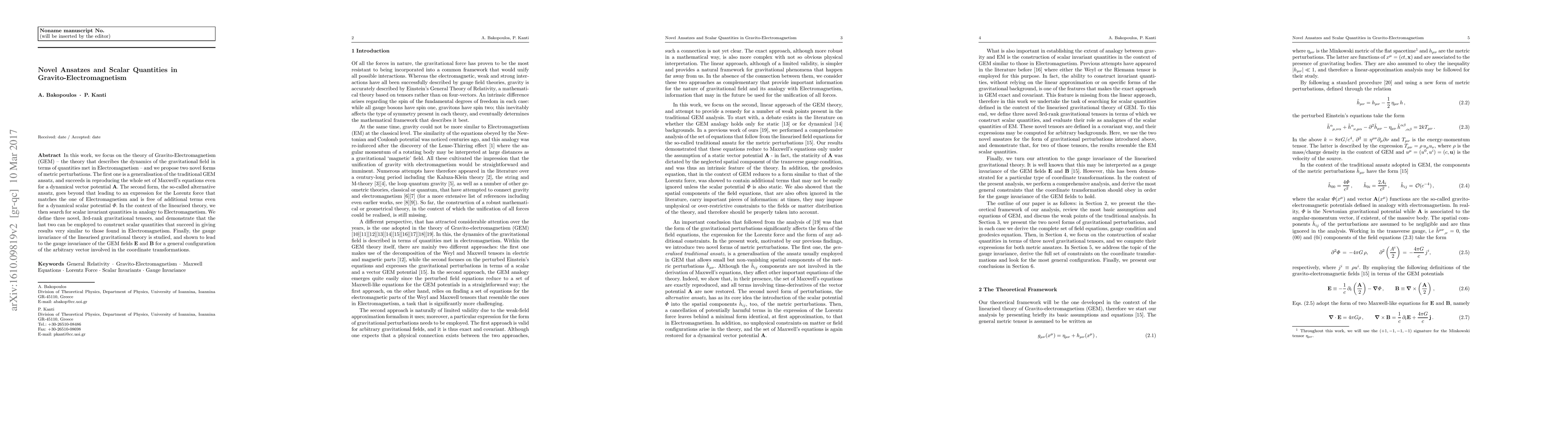 This paper proposes two novel ansatzes for Gravito-Electromagnetism, generalizing traditional approaches to reproduce Maxwell's equations and defining alternative forms that match Electromagnetism's Lorentz force. It also introduces three new gravitational tensors that yield scalar quantities similar to those in Electromagnetism, and confirms gauge invariance for the GEM fields.