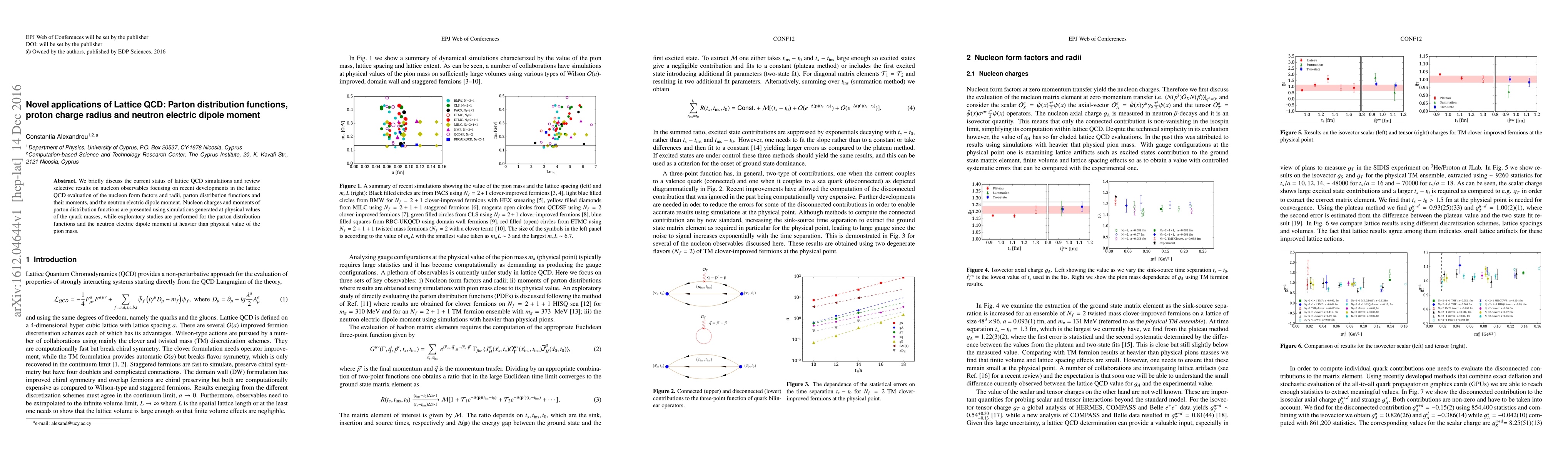 This paper reviews recent advances in lattice QCD simulations, focusing on nucleon form factors, radii, parton distribution functions, and the neutron electric dipole moment, with simulations conducted at physical and heavier quark masses.