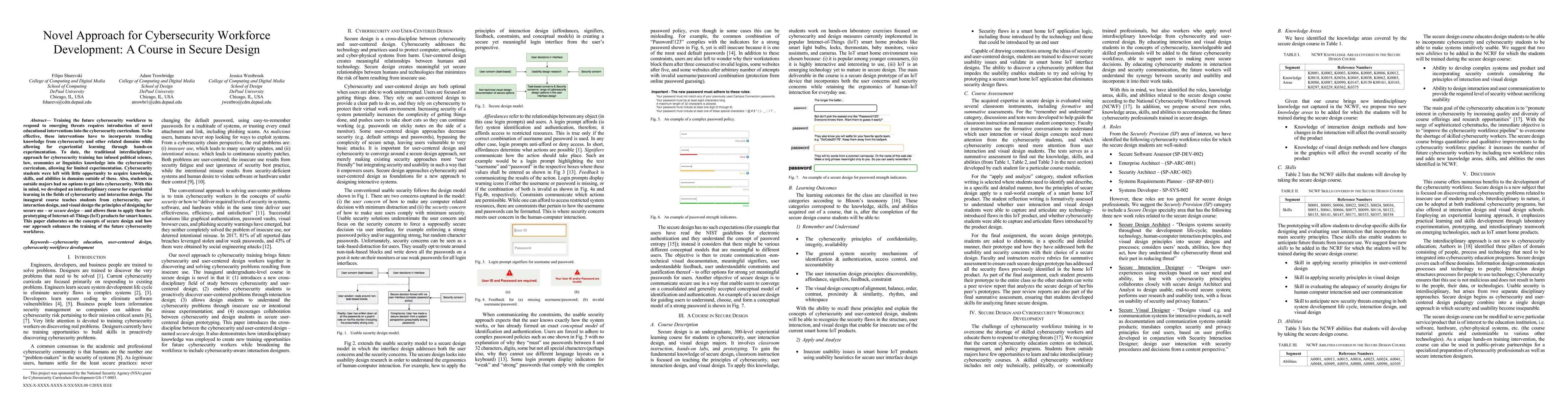 Training the future cybersecurity workforce to respond to emerging threats requires introduction of novel educational interventions into the cybersecurity curriculum. To be effective, these interventions have to incorporate trending knowledge from cybersecurity and other related domains while allowing for experiential learning through hands-on experimentation. To date, the traditional interdisciplinary approach for cybersecurity training has infused political science, law, economics or linguistics knowledge into the cybersecurity curriculum, allowing for limited experimentation. Cybersecurity students were left with little opportunity to acquire knowledge, skills, and abilities in domains outside of these. Also, students in outside majors had no options to get into cybersecurity. With this in mind, we developed an interdisciplinary course for experiential learning in the fields of cybersecurity and interaction design. The inaugural course teaches students from cybersecurity, user interaction design, and visual design the principles of designing for secure use - or secure design - and allows them to apply them for prototyping of Internet-of-Things (IoT) products for smart homes. This paper elaborates on the concepts of secure design and how our approach enhances the training of the future cybersecurity workforce.