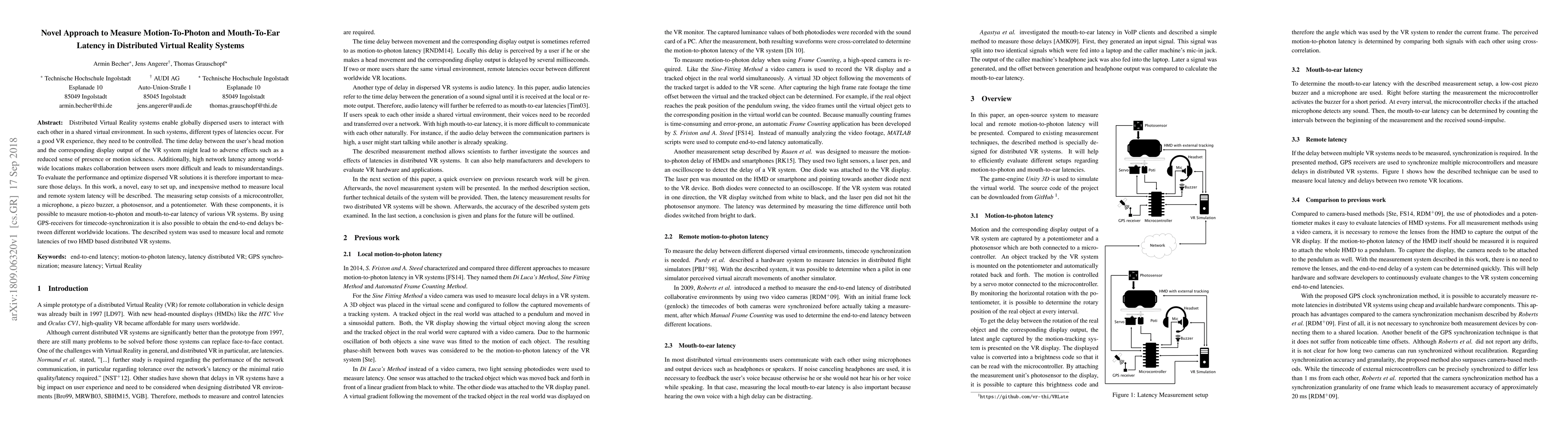 Distributed Virtual Reality systems enable globally dispersed users to interact with each other in a shared virtual environment. In such systems, different types of latencies occur. For a good VR experience, they need to be controlled. The time delay between the user's head motion and the corresponding display output of the VR system might lead to adverse effects such as a reduced sense of presence or motion sickness. Additionally, high network latency among worldwide locations makes collaboration between users more difficult and leads to misunderstandings. To evaluate the performance and optimize dispersed VR solutions it is therefore important to measure those delays. In this work, a novel, easy to set up, and inexpensive method to measure local and remote system latency will be described. The measuring setup consists of a microcontroller, a microphone, a piezo buzzer, a photosensor, and a potentiometer. With these components, it is possible to measure motion-to-photon and mouth-to-ear latency of various VR systems. By using GPS-receivers for timecode-synchronization it is also possible to obtain the end-to-end delays between different worldwide locations. The described system was used to measure local and remote latencies of two HMD based distributed VR systems.