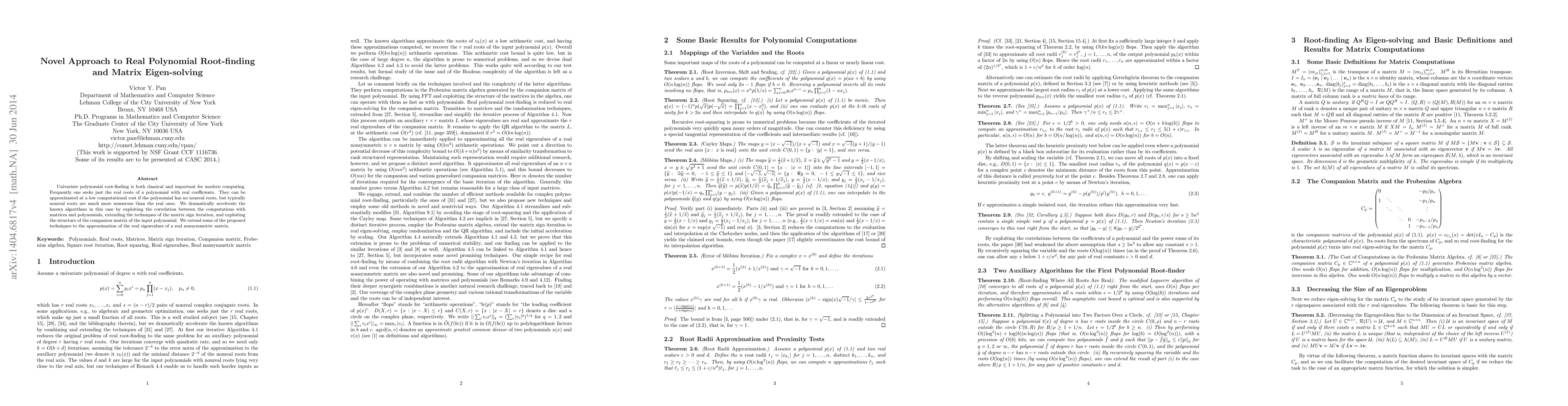 Univariate polynomial root-finding is both classical and important for modern computing. Frequently one seeks just the real roots of a polynomial with real coefficients. They can be approximated at a low computational cost if the polynomial has no nonreal roots, but typically nonreal roots are much more numerous than the real ones. We dramatically accelerate the known algorithms in this case by exploiting the correlation between the computations with matrices and polynomials, extending the techniques of the matrix sign iteration, and exploiting the structure of the companion matrix of the input polynomial. We extend some of the proposed techniques to the approximation of the real eigenvalues of a real nonsymmetric matrix.