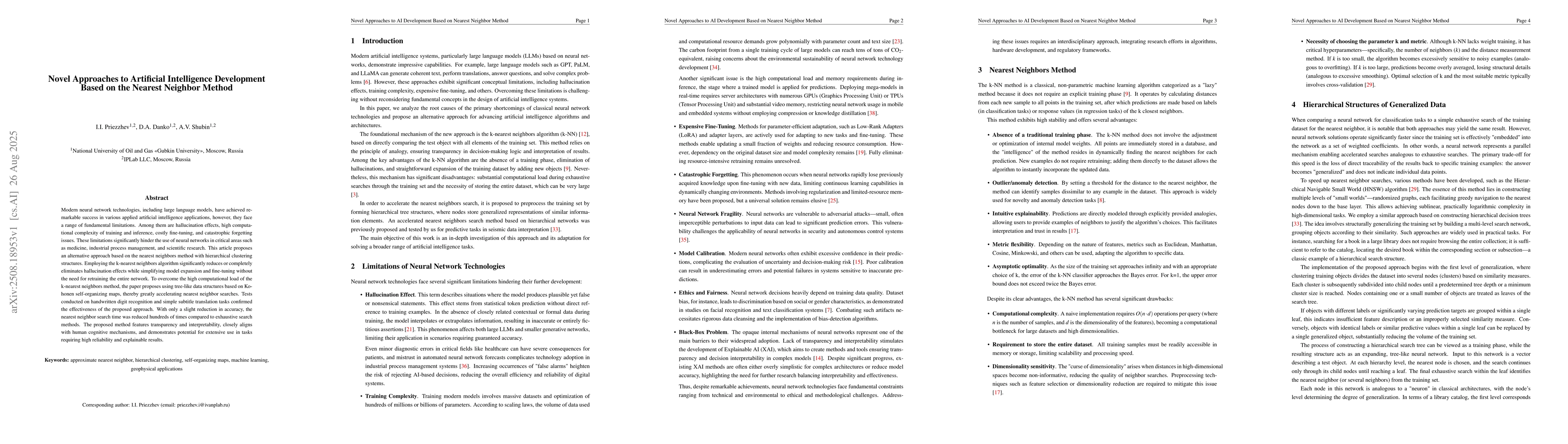 Modern neural network technologies, including large language models, have achieved remarkable success in various applied artificial intelligence applications, however, they face a range of fundamental limitations. Among them are hallucination effects, high computational complexity of training and inference, costly fine-tuning, and catastrophic forgetting issues. These limitations significantly hinder the use of neural networks in critical areas such as medicine, industrial process management, and scientific research. This article proposes an alternative approach based on the nearest neighbors method with hierarchical clustering structures. Employing the k-nearest neighbors algorithm significantly reduces or completely eliminates hallucination effects while simplifying model expansion and fine-tuning without the need for retraining the entire network. To overcome the high computational load of the k-nearest neighbors method, the paper proposes using tree-like data structures based on Kohonen self-organizing maps, thereby greatly accelerating nearest neighbor searches. Tests conducted on handwritten digit recognition and simple subtitle translation tasks confirmed the effectiveness of the proposed approach. With only a slight reduction in accuracy, the nearest neighbor search time was reduced hundreds of times compared to exhaustive search methods. The proposed method features transparency and interpretability, closely aligns with human cognitive mechanisms, and demonstrates potential for extensive use in tasks requiring high reliability and explainable results.