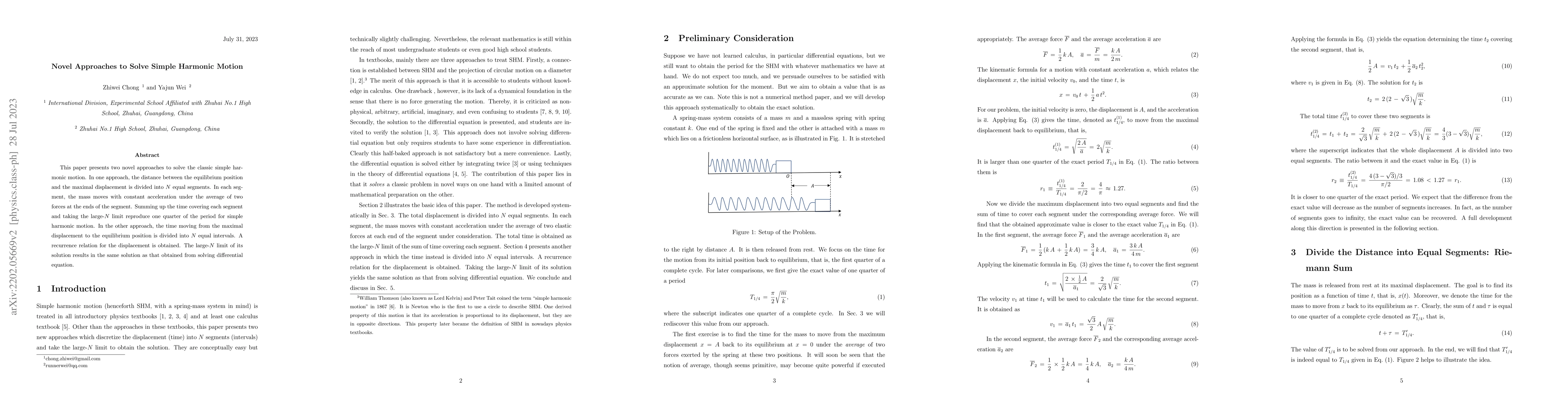 This paper introduces two innovative methods to solve simple harmonic motion, one segmenting displacement into equal parts with constant acceleration and the other dividing time into intervals to derive a recurrence relation, both converging to the same solution as traditional differential equation methods.