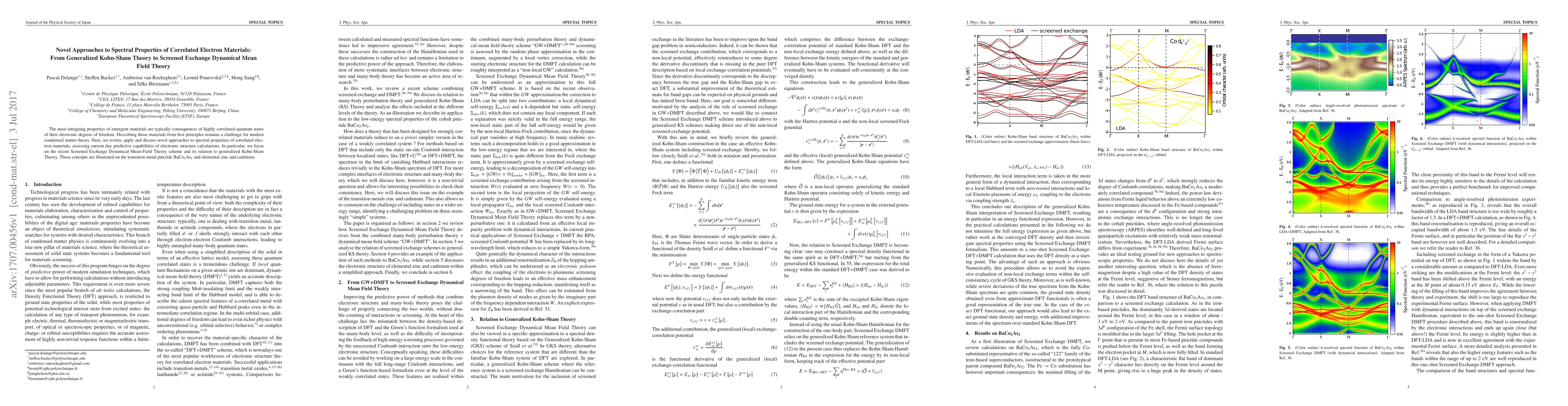 This paper reviews novel theoretical approaches for understanding the spectral properties of correlated electron materials, emphasizing the Screened Exchange Dynamical Mean-Field Theory and its connection to generalized Kohn-Sham theory. The study assesses the predictive power of these methods using transition metal pnictide BaCo$_2$As$_2$ and elemental zinc and cadmium as examples.
