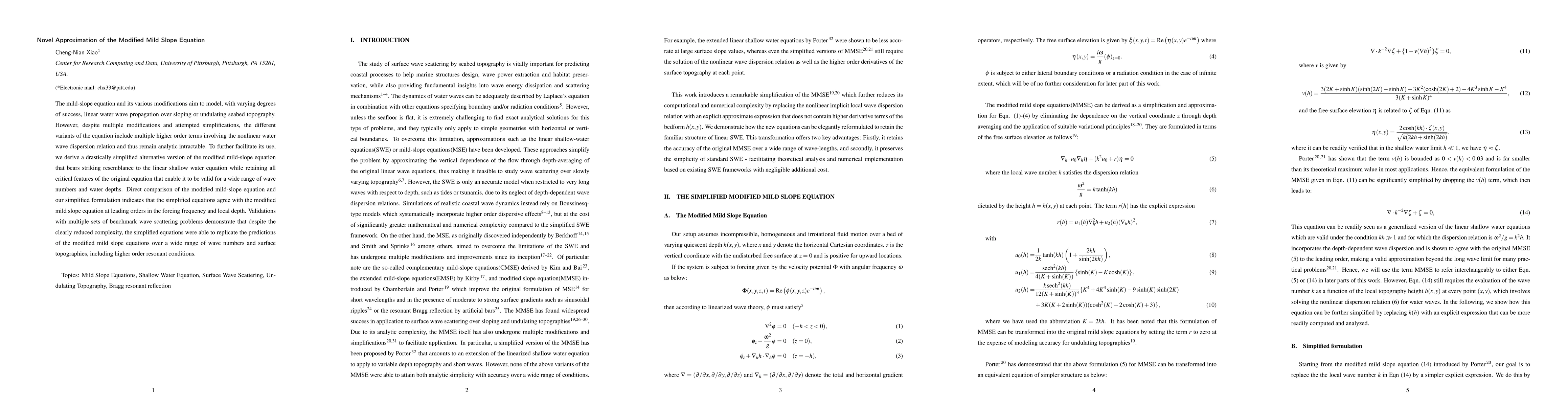 This research introduces a simplified version of the modified mild-slope equation, which models wave propagation over sloping seabeds. The new formulation resembles the linear shallow water equation but retains the original equation's critical features, working across a wide range of wave numbers and depths. Validations show the simplified equations accurately replicate predictions of the modified mild slope equations, even under complex conditions.