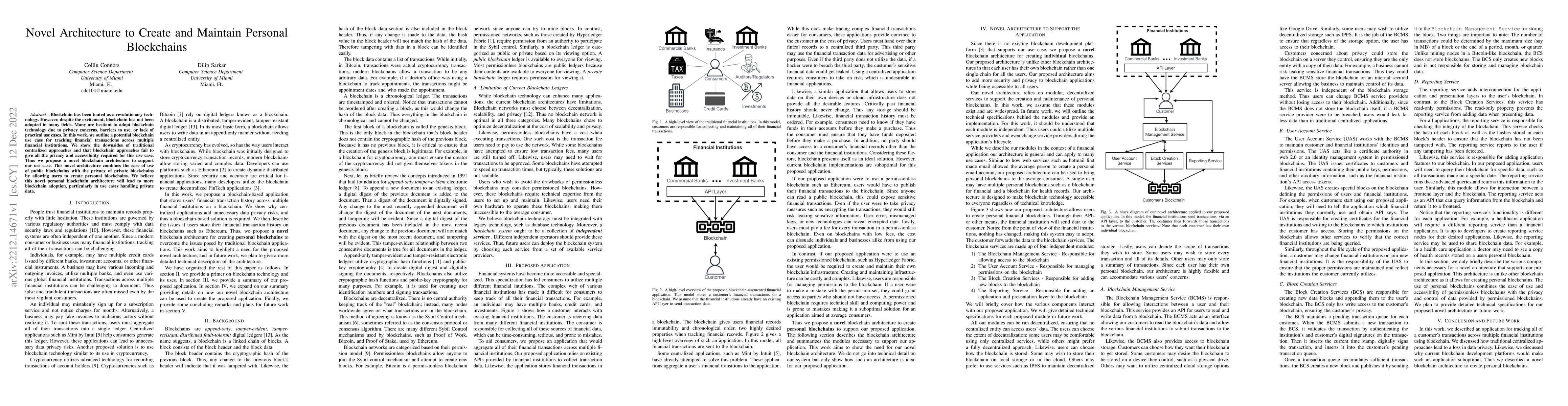 Blockchain has been touted as a revolutionary technology. However, despite the excitement, blockchain has not been adopted in many fields. Many are hesitant to adopt blockchain technology due to privacy concerns, barriers to use, or lack of practical use cases. In this work, we outline a potential blockchain use case for tracking financial transactions across multiple financial institutions. We show the downsides of traditional centralized approaches and that blockchain approaches fail to give all the privacy and accessibility required for this use case. Thus we propose a novel blockchain architecture to support our use case. This novel architecture combines the ease of use of public blockchains with the privacy of private blockchains by allowing users to create personal blockchains. We believe this novel personal blockchain architecture will lead to more blockchain adoption, particularly in use cases handling private data.