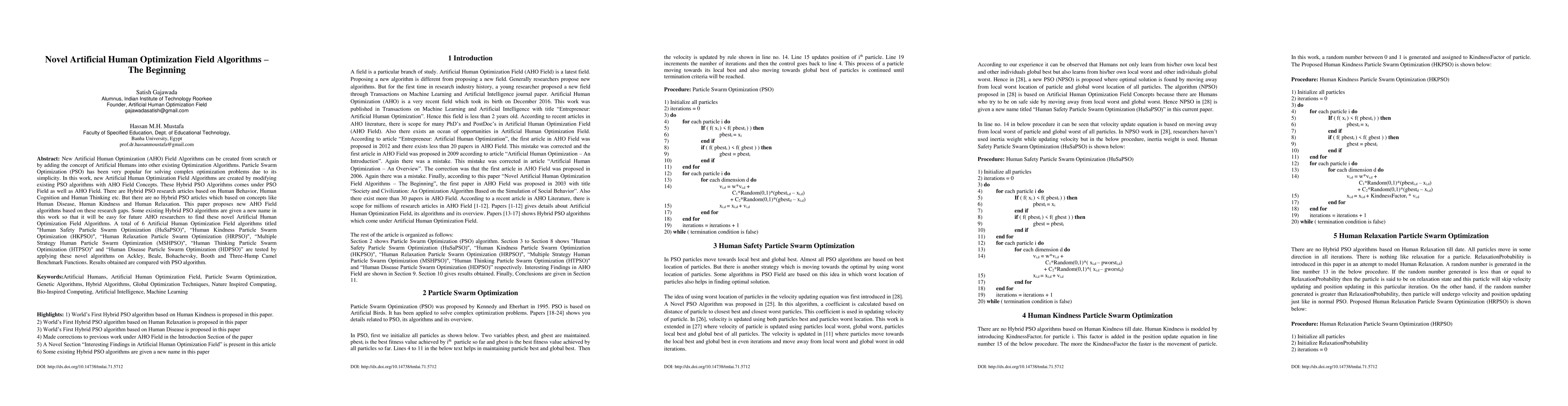 New Artificial Human Optimization (AHO) Field Algorithms can be created from scratch or by adding the concept of Artificial Humans into other existing Optimization Algorithms. Particle Swarm Optimization (PSO) has been very popular for solving complex optimization problems due to its simplicity. In this work, new Artificial Human Optimization Field Algorithms are created by modifying existing PSO algorithms with AHO Field Concepts. These Hybrid PSO Algorithms comes under PSO Field as well as AHO Field. There are Hybrid PSO research articles based on Human Behavior, Human Cognition and Human Thinking etc. But there are no Hybrid PSO articles which based on concepts like Human Disease, Human Kindness and Human Relaxation. This paper proposes new AHO Field algorithms based on these research gaps. Some existing Hybrid PSO algorithms are given a new name in this work so that it will be easy for future AHO researchers to find these novel Artificial Human Optimization Field Algorithms. A total of 6 Artificial Human Optimization Field algorithms titled "Human Safety Particle Swarm Optimization (HuSaPSO)", "Human Kindness Particle Swarm Optimization (HKPSO)", "Human Relaxation Particle Swarm Optimization (HRPSO)", "Multiple Strategy Human Particle Swarm Optimization (MSHPSO)", "Human Thinking Particle Swarm Optimization (HTPSO)" and "Human Disease Particle Swarm Optimization (HDPSO)" are tested by applying these novel algorithms on Ackley, Beale, Bohachevsky, Booth and Three-Hump Camel Benchmark Functions. Results obtained are compared with PSO algorithm.