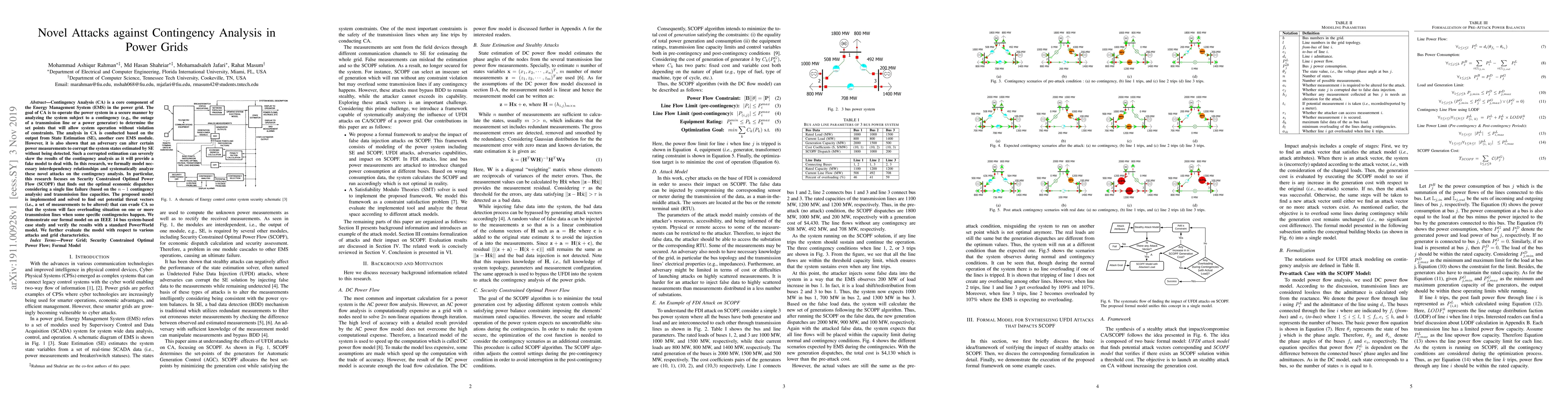 This research investigates novel attacks on Contingency Analysis (CA) in power grids, focusing on how adversaries can manipulate power measurements to corrupt state estimations, leading to skewed CA results. The study models interdependency relationships and identifies potential threat vectors that can cause overloading under specific contingencies, demonstrated through an IEEE 14 bus system case study and verified with a PowerWorld model.