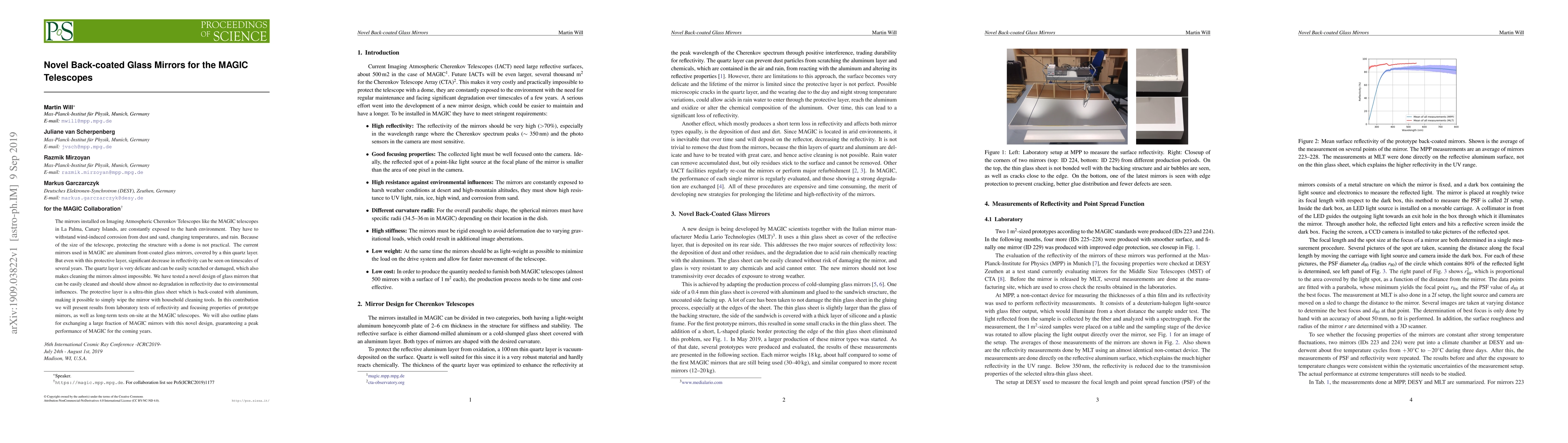 Researchers developed a new design for glass mirrors used in MAGIC telescopes, featuring an ultra-thin back-coated aluminum layer that provides easy cleaning and maintains reflectivity over time.
