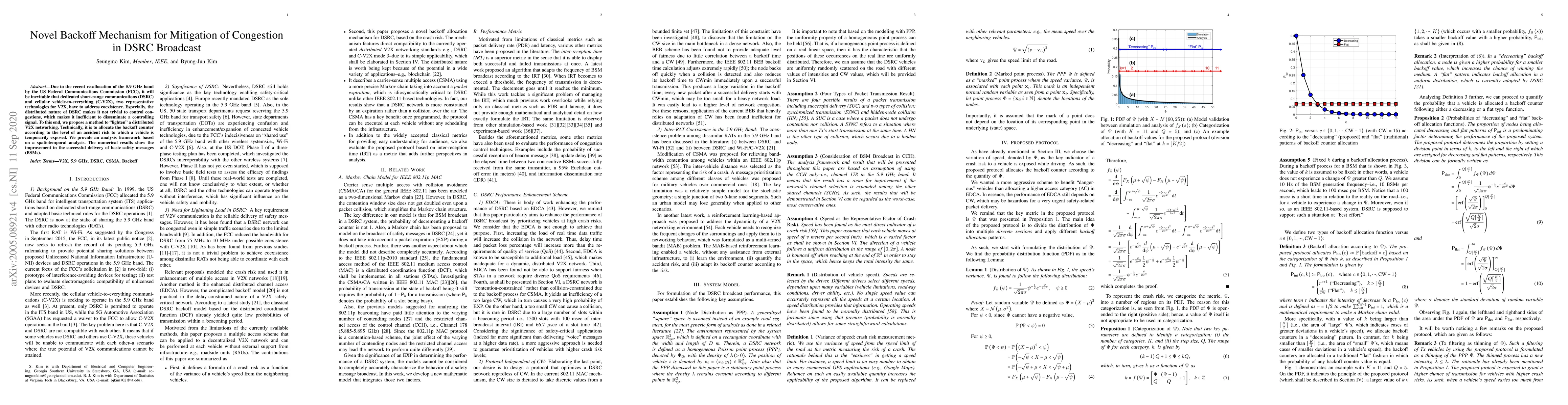 This paper proposes a novel backoff mechanism to mitigate congestion in DSRC broadcast by adjusting the backoff counter based on accident risk levels, aiming to improve the efficiency of distributed V2X networks. The method shows enhanced successful delivery of basic safety messages through a spatiotemporal analysis framework.