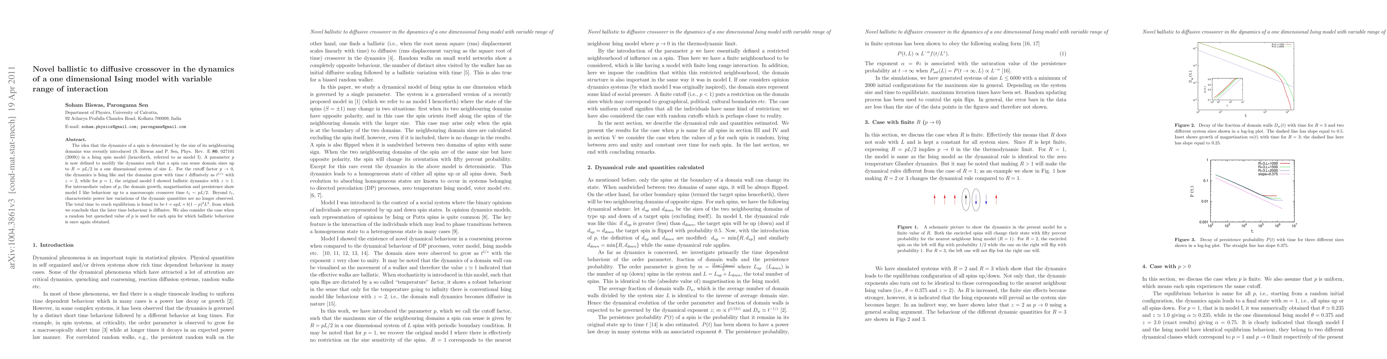 This paper investigates the dynamics of a one-dimensional Ising model with variable interaction range, showing a crossover from ballistic to diffusive behavior as a parameter $p$ varies. For small $p$, the dynamics is diffusive, while for larger $p$, it initially behaves like the original model but eventually transitions to a diffusive regime.