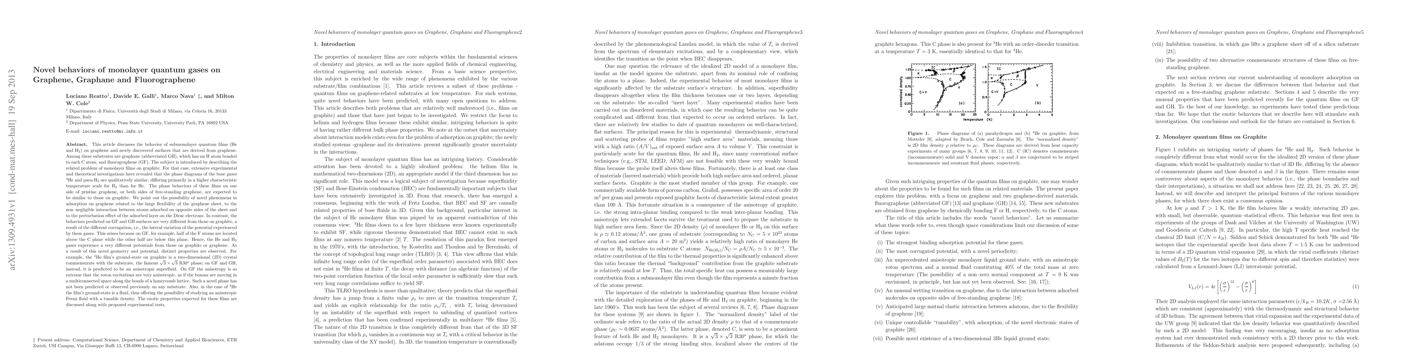 This article discusses the behavior of submonolayer quantum films (He and H2) on graphene and newly discovered surfaces that are derived from graphene. Among these substrates are graphane (abbreviated GH), which has an H atom bonded to each C atom, and fluorographene (GF). For the graphite case, extensive experimental and theoretical investigations have revealed that the phase diagrams of the bose gases 4He and para-H2 are qualitatively similar, differing primarily in a higher characteristic temperature scale for H2 than for He. The phase behaviors of these films on one side of pristine graphene, or both sides of free-standing graphene, are expected to be similar to those on graphite. We point out the possibility of novel phenomena in adsorption on graphene related to the large flexibility of the graphene sheet, to the non--negligible interaction between atoms adsorbed on opposite sides of the sheet and to the perturbation effect of the adsorbed layer on the Dirac electrons. In contrast, the behaviors predicted on GF and GH surfaces are very different from those on graphite, a result of the different corrugation, i.e., the lateral variation of the potential experienced by these gases. As a result of this novel geometry and potential, distinct properties are observed. For example, the 4He film's ground-state on graphite is a two-dimensional (2D) crystal commensurate with the substrate; on GF and GH, instead, it is predicted to be an anisotropic superfluid. On GF the anisotropy is so extreme that the roton excitations are very anisotropic, as if the bosons are moving in a multiconnected space along the bonds of a honeycomb lattice. Such a novel phase has not been predicted or observed previously on any substrate. Also, in the case of 3He the film's ground-state is a fluid, thus offering the possibility of studying an anisotropic Fermi fluid with a tunable density.