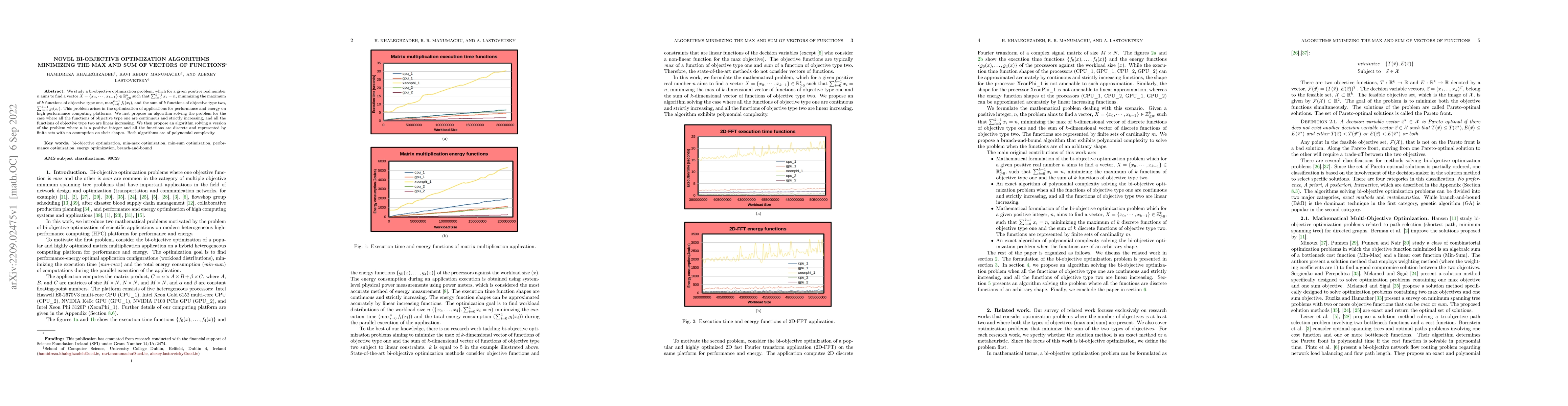 We study a bi-objective optimization problem, which for a given positive real number $n$ aims to find a vector $X = \{x_0,\cdots,x_{k-1}\} \in \mathbb{R}^{k}_{\ge 0}$ such that $\sum_{i=0}^{k-1} x_i = n$, minimizing the maximum of $k$ functions of objective type one, $\max_{i=0}^{k-1} f_i(x_i)$, and the sum of $k$ functions of objective type two, $\sum_{i=0}^{k-1} g_i(x_i)$. This problem arises in the optimization of applications for performance and energy on high performance computing platforms. We first propose an algorithm solving the problem for the case where all the functions of objective type one are continuous and strictly increasing, and all the functions of objective type two are linear increasing. We then propose an algorithm solving a version of the problem where $n$ is a positive integer and all the functions are discrete and represented by finite sets with no assumption on their shapes. Both algorithms are of polynomial complexity.