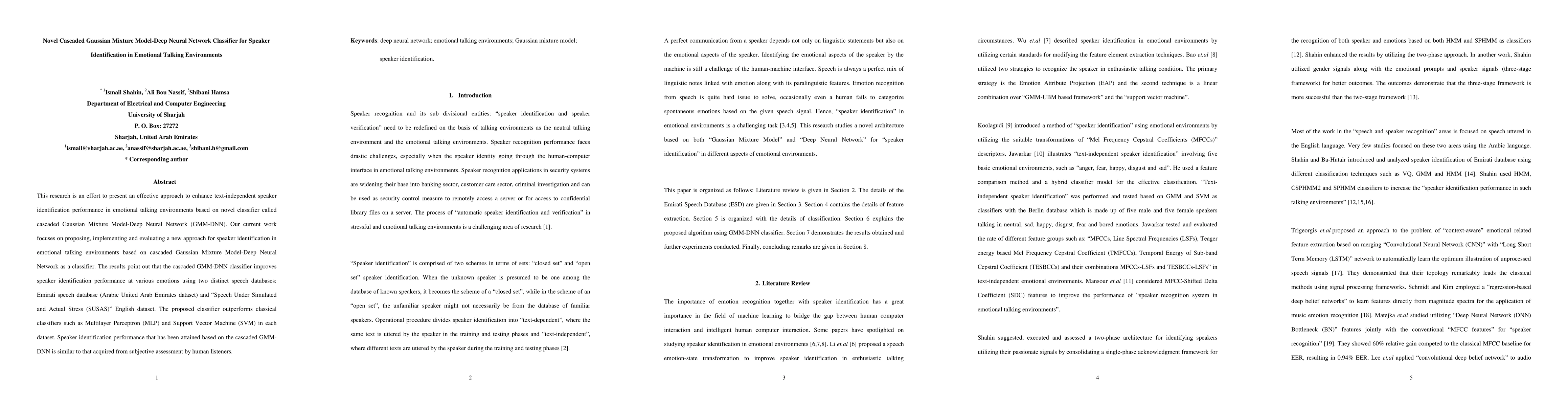 This paper proposes a novel Cascaded Gaussian Mixture Model-Deep Neural Network (GMM-DNN) classifier for enhancing text-independent speaker identification in emotional contexts. The GMM-DNN classifier outperforms traditional methods like MLP and SVM, achieving results comparable to human listener assessments.
