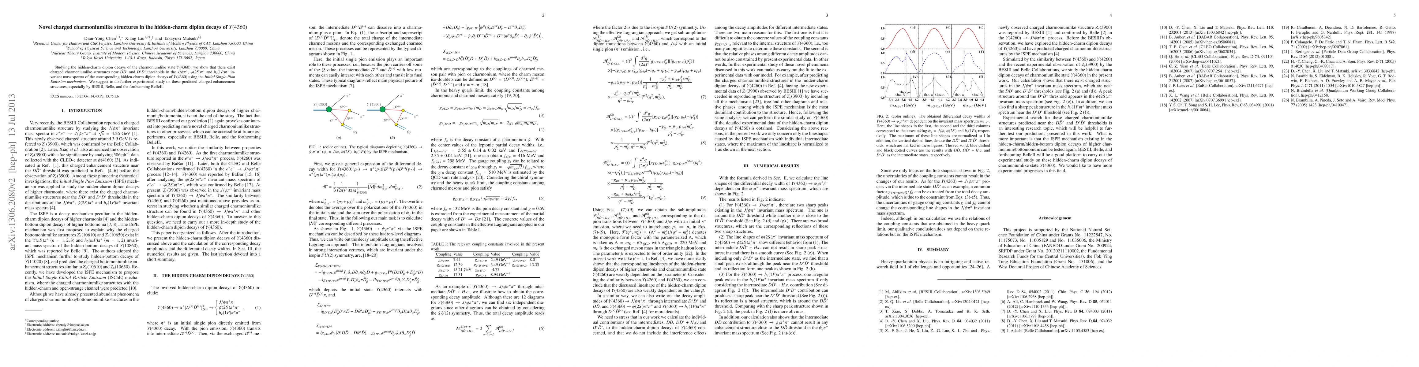 Studying the hidden-charm dipion decays of the charmoniumlike state Y(4360), we show that there exist charged charmoniumlike structures near $D\bar{D}^*$ and $D^*\bar{D}^*$ thresholds in the $J/\psi\pi^+$, $\psi(2S)\pi^+$ and $h_c(1P)\pi^+$ invariant mass spectra of the corresponding hidden-charm dipion decays of Y(4360) using the {\it{Initial Single Pion Emission} mechanism}. We suggest to do further experimental study on these predicted charged enhancement structures, especially by BESIII, Belle, and the forthcoming BelleII.