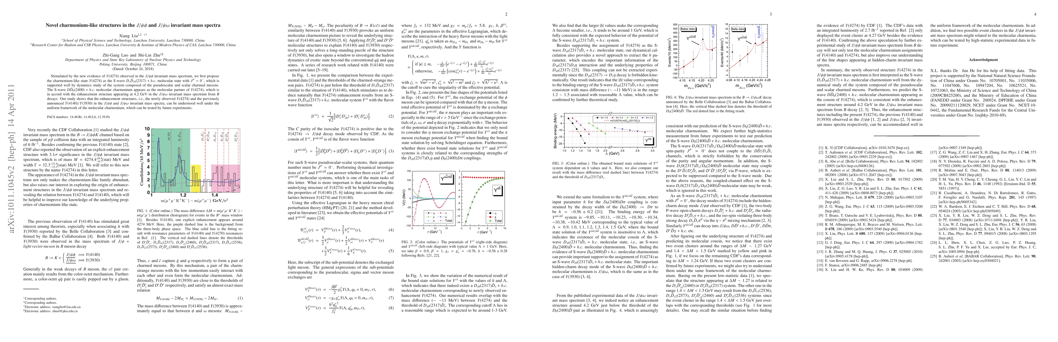 Researchers propose a charmonium-like state Y(4274) as a molecular state composed of D_s and D_0 mesons, which explains enhancement structures in J/ψφ and J/ψω invariant mass spectra. The findings support a uniform framework for understanding these enhancements.