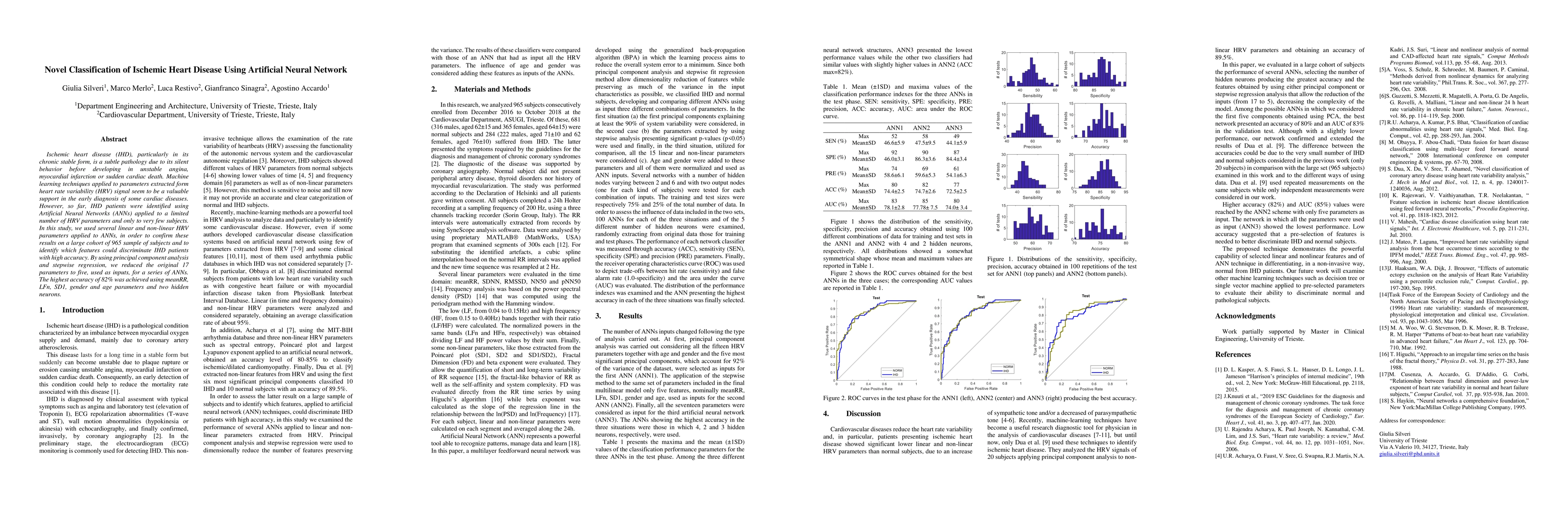 Ischemic heart disease (IHD), particularly in its chronic stable form, is a subtle pathology due to its silent behavior before developing in unstable angina, myocardial infarction or sudden cardiac death. Machine learning techniques applied to parameters extracted form heart rate variability (HRV) signal seem to be a valuable support in the early diagnosis of some cardiac diseases. However, so far, IHD patients were identified using Artificial Neural Networks (ANNs) applied to a limited number of HRV parameters and only to very few subjects. In this study, we used several linear and non-linear HRV parameters applied to ANNs, in order to confirm these results on a large cohort of 965 sample of subjects and to identify which features could discriminate IHD patients with high accuracy. By using principal component analysis and stepwise regression, we reduced the original 17 parameters to five, used as inputs, for a series of ANNs. The highest accuracy of 82% was achieved using meanRR, LFn, SD1, gender and age parameters and two hidden neurons.