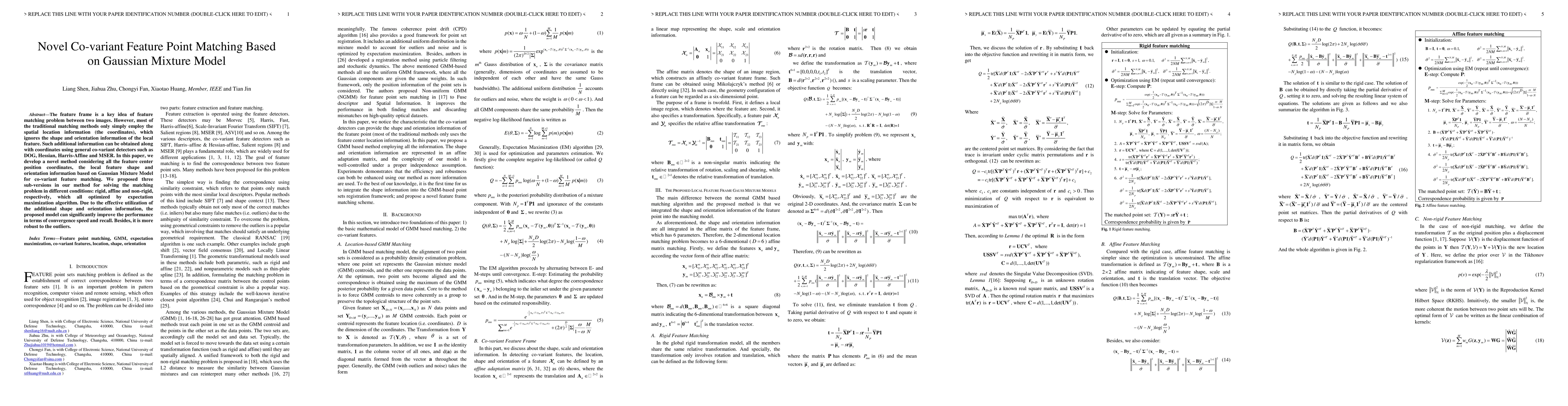 The feature frame is a key idea of feature matching problem between two images. However, most of the traditional matching methods only simply employ the spatial location information (the coordinates), which ignores the shape and orientation information of the local feature. Such additional information can be obtained along with coordinates using general co-variant detectors such as DOG, Hessian, Harris-Affine and MSER. In this paper, we develop a novel method considering all the feature center position coordinates, the local feature shape and orientation information based on Gaussian Mixture Model for co-variant feature matching. We proposed three sub-versions in our method for solving the matching problem in different conditions: rigid, affine and non-rigid, respectively, which all optimized by expectation maximization algorithm. Due to the effective utilization of the additional shape and orientation information, the proposed model can significantly improve the performance in terms of convergence speed and recall. Besides, it is more robust to the outliers.