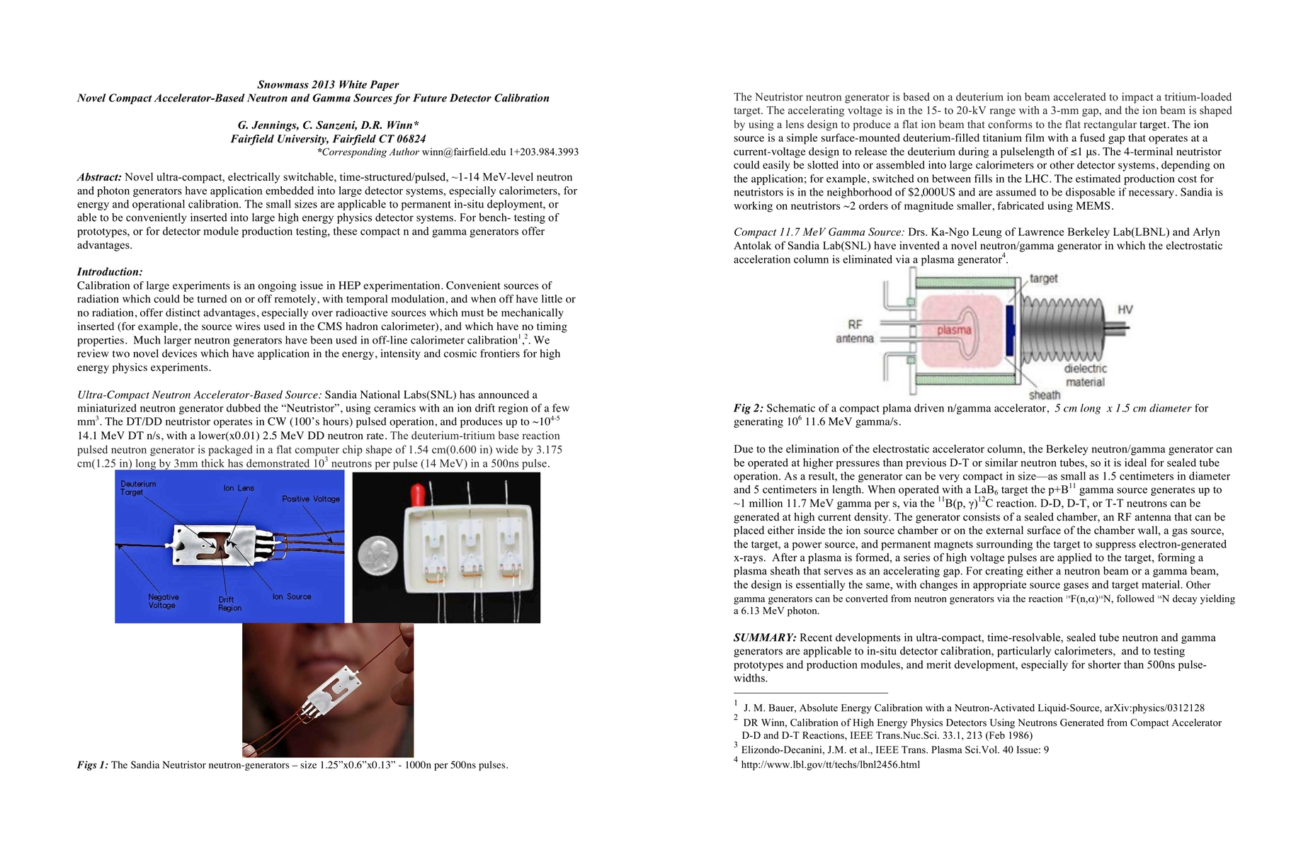 Novel ultra-compact, electrically switchable, time-structured/pulsed, ~1-14 MeV-level neutron and photon generators have application embedded into large detector systems, especially calorimeters, for energy and operational calibration. The small sizes are applicable to permanent in-situ deployment, or able to be conveniently inserted into large high energy physics detector systems. For bench- testing of prototypes, or for detector module production testing, these compact n and gamma generators offer advantages.