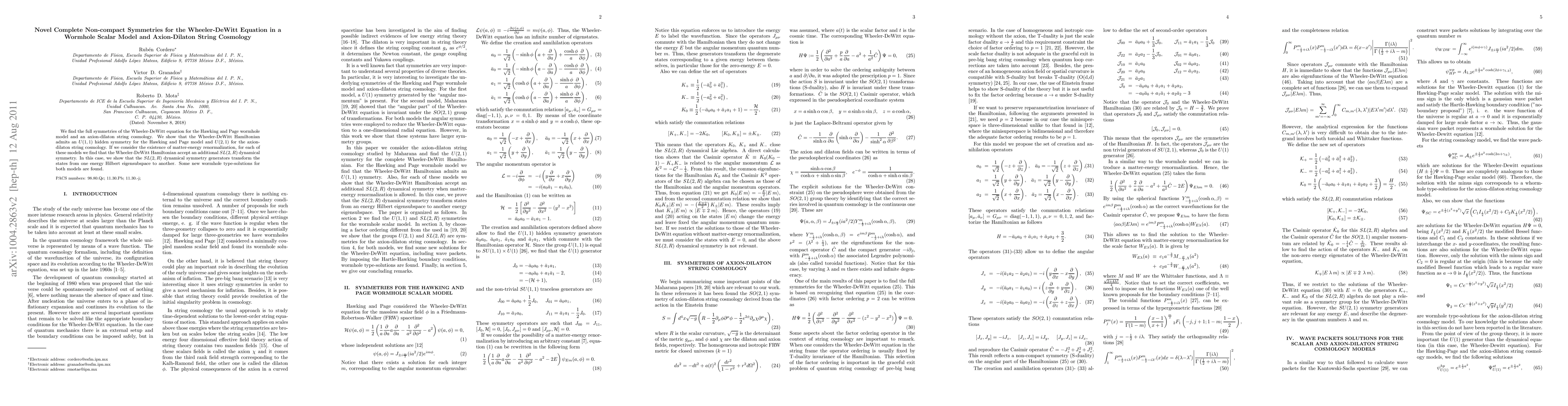 This paper reveals novel complete non-compact symmetries for the Wheeler-DeWitt equation in the Hawking and Page wormhole model and axion-dilaton string cosmology, identifying U(1,1) and U(2,1) symmetries respectively. Additionally, it finds an SL(2,R) dynamical symmetry due to matter-energy renormalization, facilitating state transformations between energy eigensubspaces.