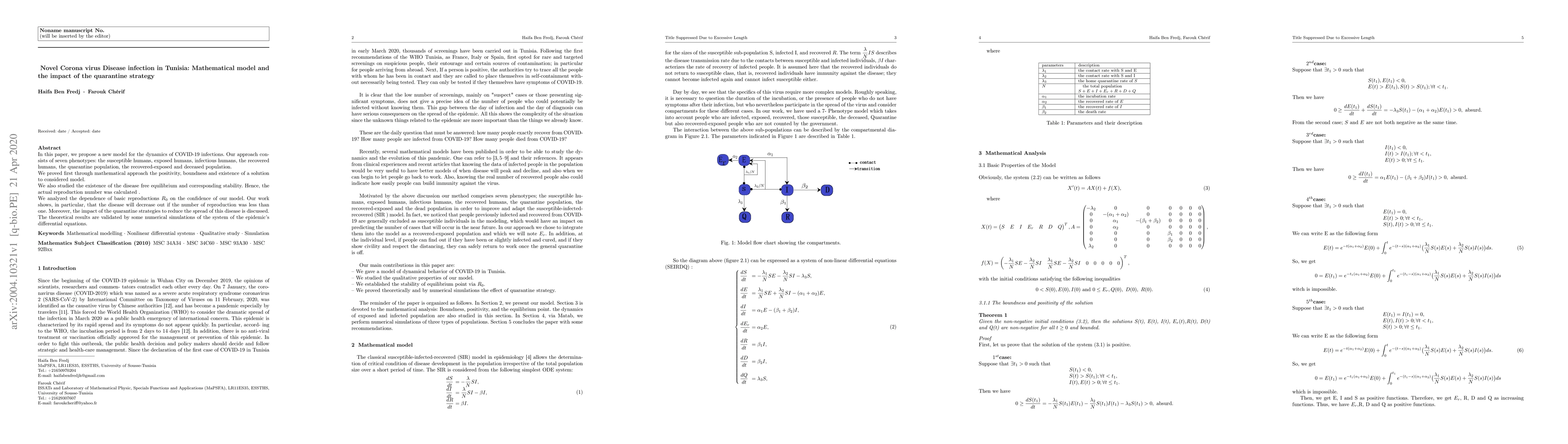 This paper proposes a seven-phenotype mathematical model to analyze COVID-19 dynamics in Tunisia, including quarantine effects. The model's positivity, boundedness, and stability are proven, and the basic reproduction number is calculated to determine disease spread reduction.