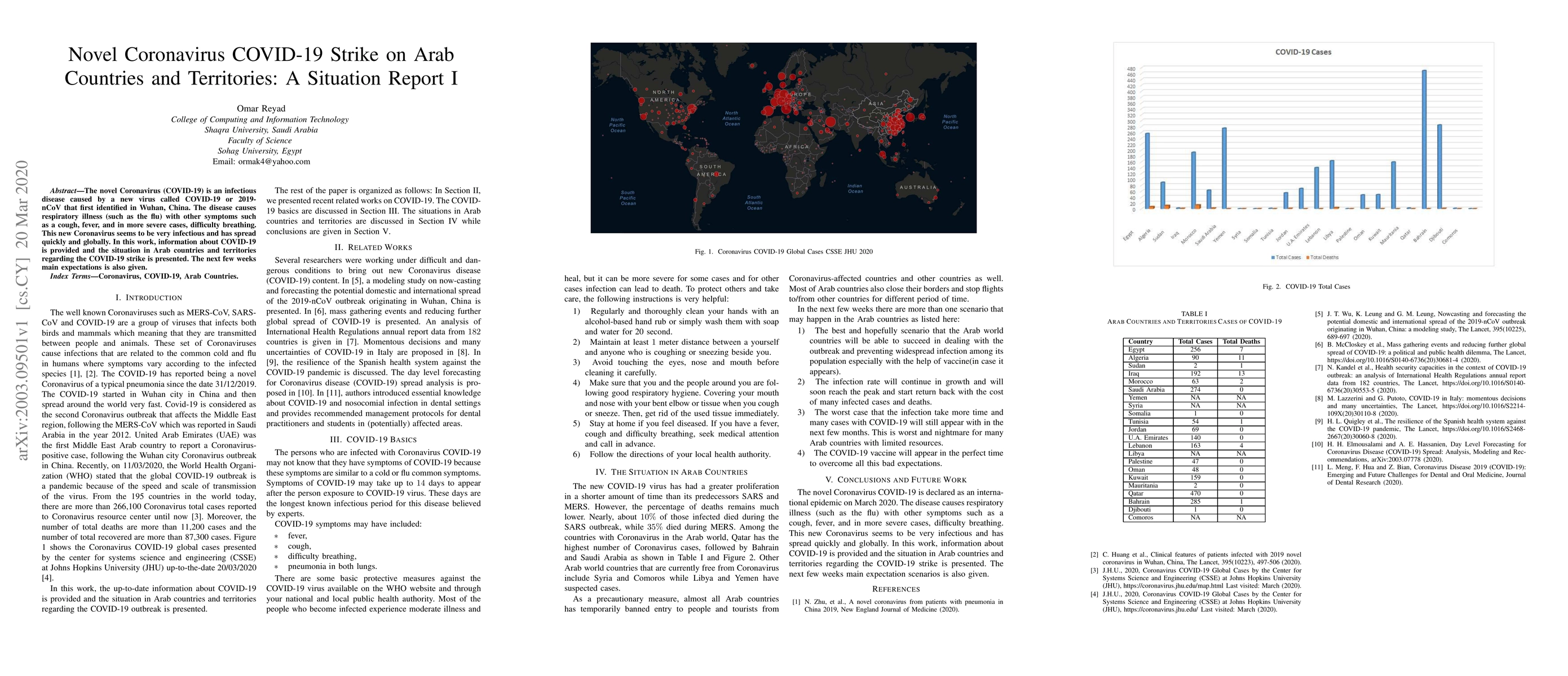 The novel Coronavirus (COVID-19) is an infectious disease caused by a new virus called COVID-19 or 2019-nCoV that first identified in Wuhan, China. The disease causes respiratory illness (such as the flu) with other symptoms such as a cough, fever, and in more severe cases, difficulty breathing. This new Coronavirus seems to be very infectious and has spread quickly and globally. In this work, information about COVID-19 is provided and the situation in Arab countries and territories regarding the COVID-19 strike is presented. The next few weeks main expectations is also given.