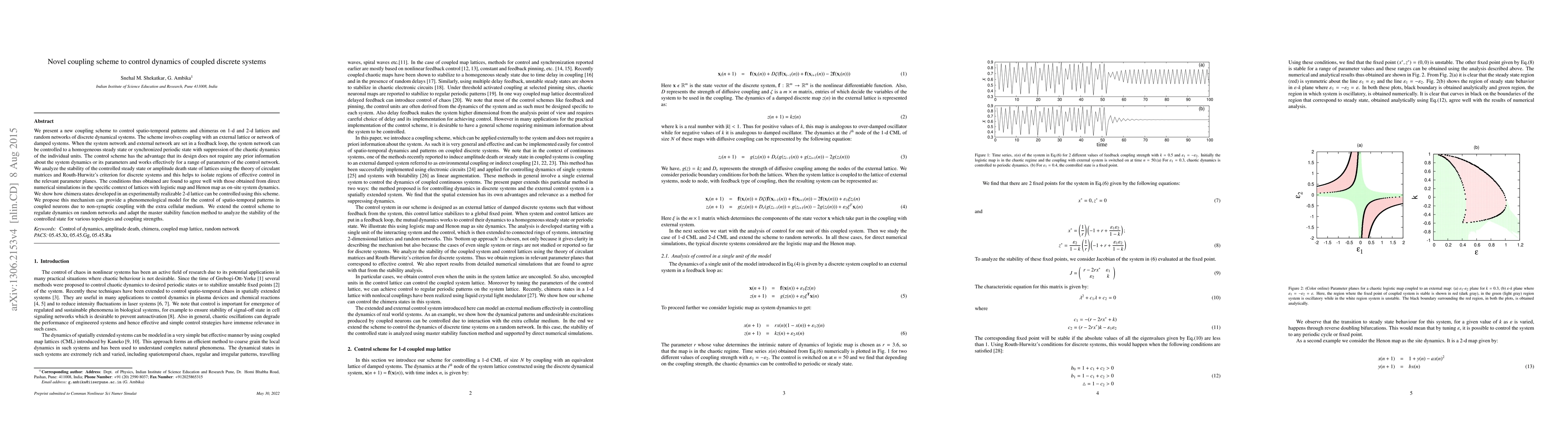 We present a new coupling scheme to control spatio-temporal patterns and chimeras on 1-d and 2-d lattices and random networks of discrete dynamical systems. The scheme involves coupling with an external lattice or network of damped systems. When the system network and external network are set in a feedback loop, the system network can be controlled to a homogeneous steady state or synchronized periodic state with suppression of the chaotic dynamics of the individual units. The control scheme has the advantage that its design does not require any prior information about the system dynamics or its parameters and works effectively for a range of parameters of the control network. We analyze the stability of the controlled steady state or amplitude death state of lattices using the theory of circulant matrices and Routh-Hurwitz's criterion for discrete systems and this helps to isolate regions of effective control in the relevant parameter planes. The conditions thus obtained are found to agree well with those obtained from direct numerical simulations in the specific context of lattices with logistic map and Henon map as on-site system dynamics. We show how chimera states developed in an experimentally realizable 2-d lattice can be controlled using this scheme. We propose this mechanism can provide a phenomenological model for the control of spatio-temporal patterns in coupled neurons due to non-synaptic coupling with the extra cellular medium. We extend the control scheme to regulate dynamics on random networks and adapt the master stability function method to analyze the stability of the controlled state for various topologies and coupling strengths.